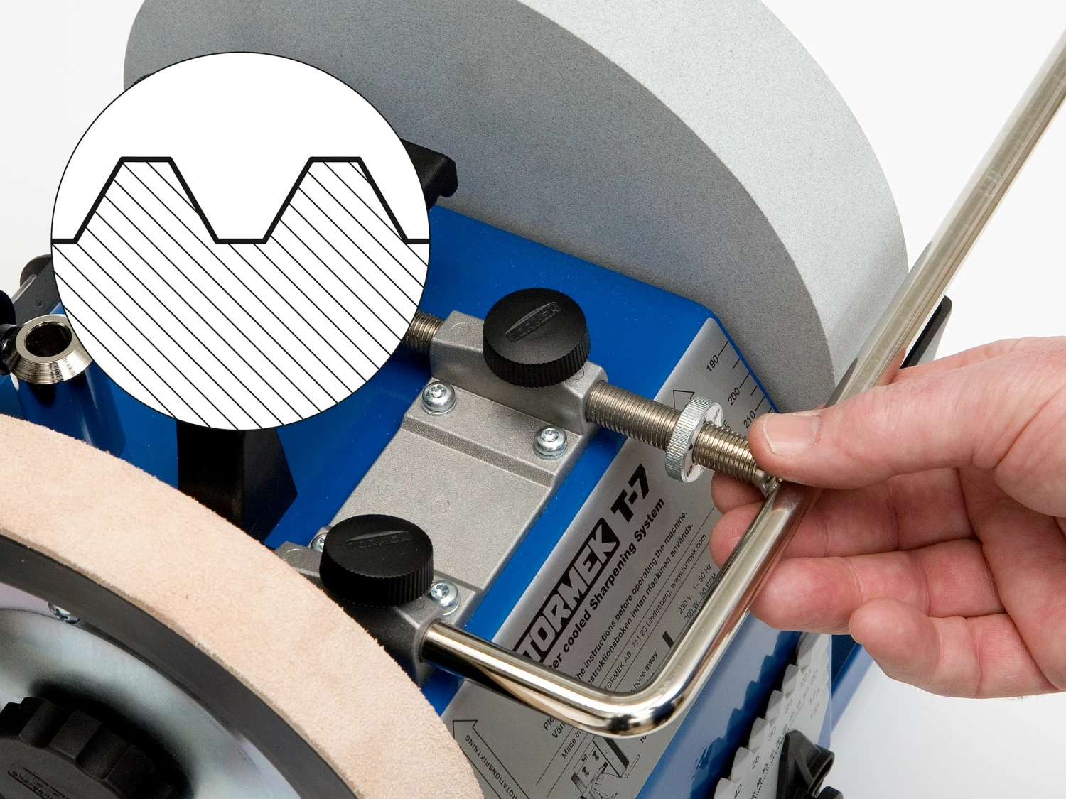The versatile Tormek Universal Support is the basis of the Tormek system. It is made of 12 mm (approx. 1/2″) round steel and has a double mounting for maximum stability. The Universal Support incorporates a micro adjust for exact and fast fine setting.
