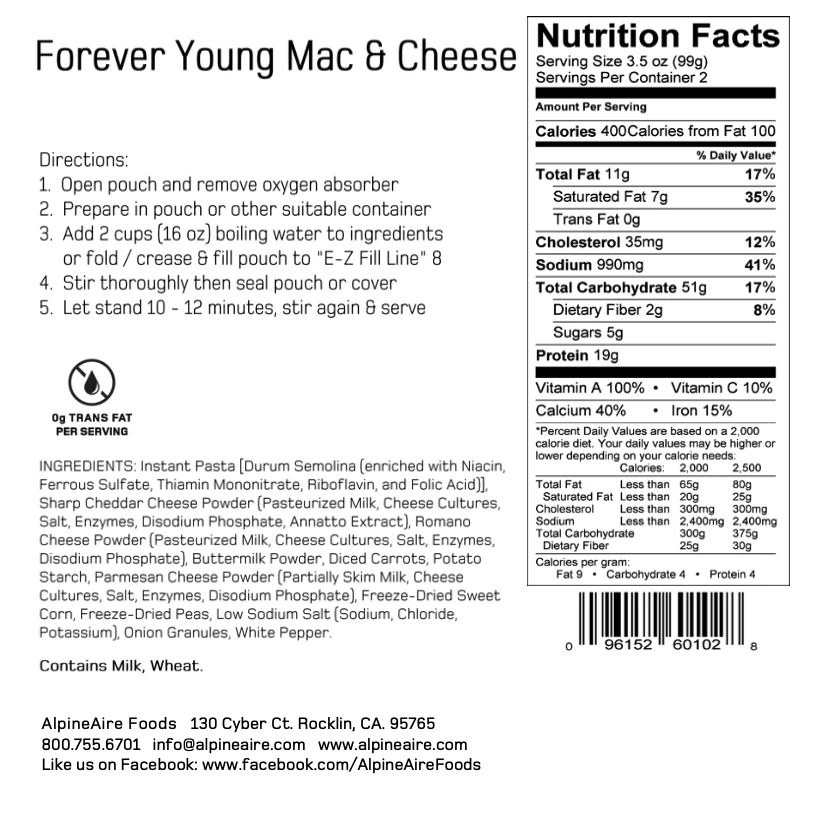 The AlpineAire Forever Young Mac & Cheese is a lifesaver on the trail! It’s easy to prepare, tastes great, and keeps me energized during long hikes. Perfect for backpacking trips!