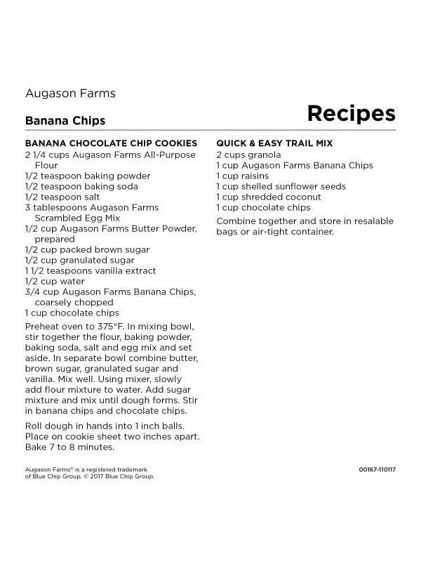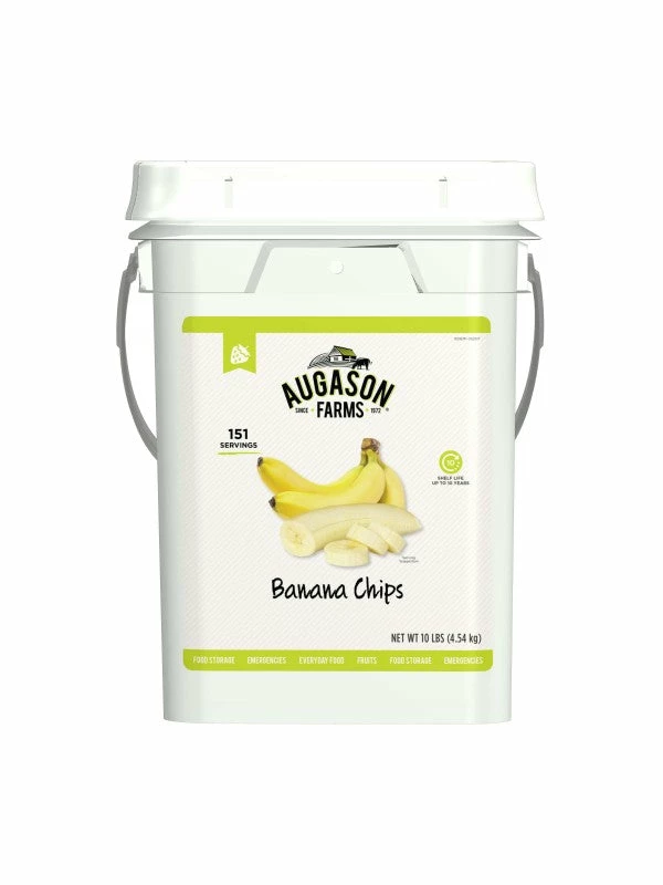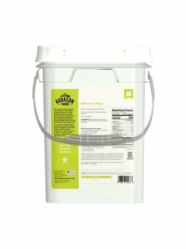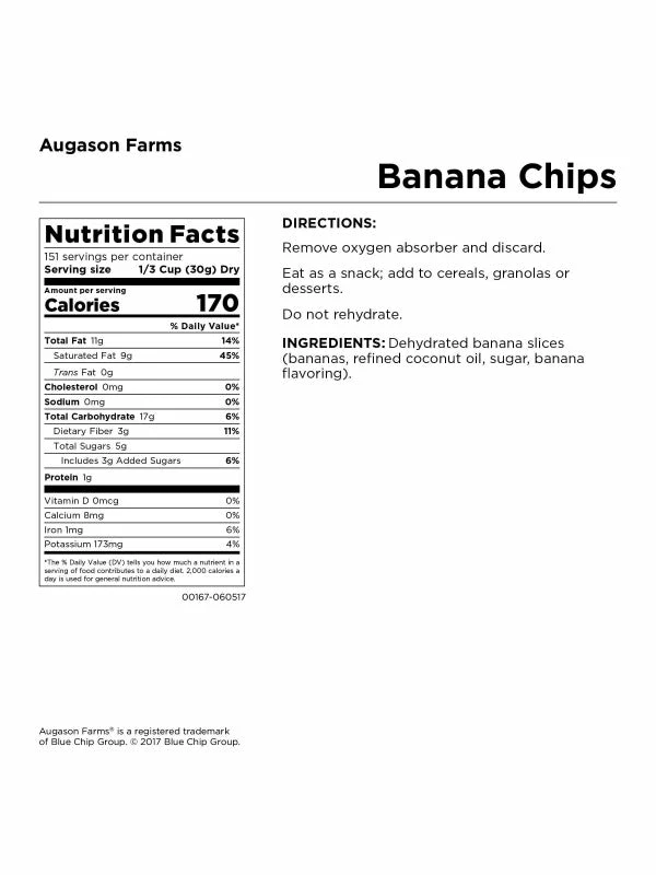 Banana Chips can be used in so many ways: as a sweet and crispy snack, in trail mix, in hot oatmeal, with ice cream, or in your favorite cookie recipe. The options are endless! Augason Farms Banana Chips are a favourite for adults and kids of all ages. They’re perfect for everyday use, long term food storage or used in your emergency food kit.Â
