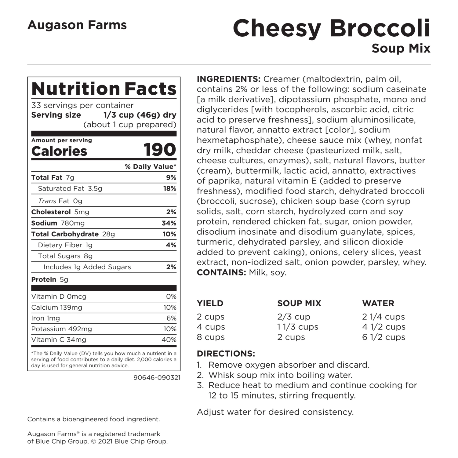 When you need a quick weeknight meal, you can trust our Cheesy Broccoli Soup Mix to provide you with delicious flavour and quality nutrients like immunity boosting vitamin C. Just add water and enjoy this delicious dehydrated food item. Serve as a soup on its one or get creative and add this mix to your casseroles or use it as a topping on your potatoes.