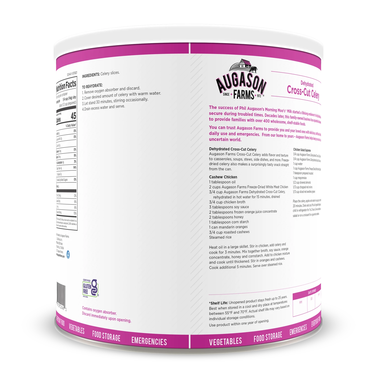 Celery adds flavour and variety to dishes such as chicken salad, soup mixes, vegetable stock, and vegetarian entrees. Augason Farms Dehydrated Cross Cut Celery is sliced, ready to use, and eliminates the worry of wilting and spoiling. And, they’re certified gluten free.