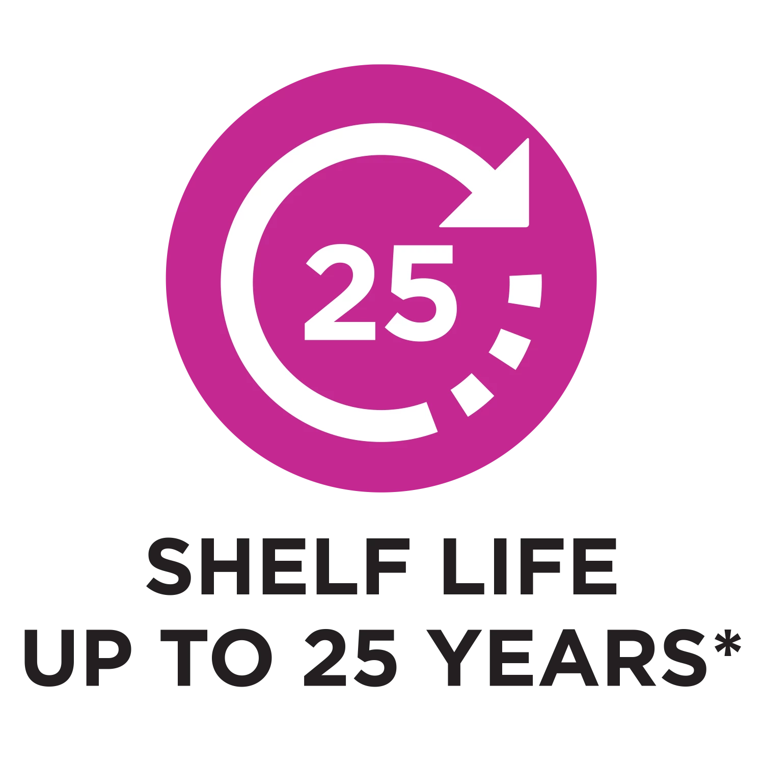 * Shelf life up to 25 years when unopened. Best when stored in a cool and dry place at temperatures between 55°F and 70°F. Actual shelf life may vary based on individual storage conditions.
