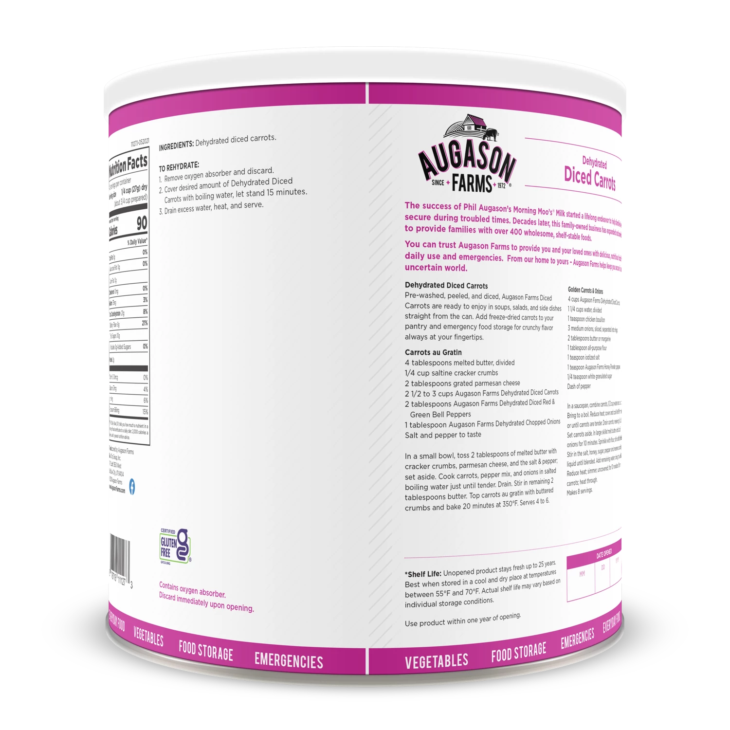 Pre-peeled and diced, Augason Farms Diced Carrots are ready to add to your favourite soup mixes, salads, and stir-fried rice. These carrots are loaded with all the same vitamins as fresh carrots and have a shelf life of up to 25 years, so you can use them now or save them for later. Diced Carrots are certified gluten free.