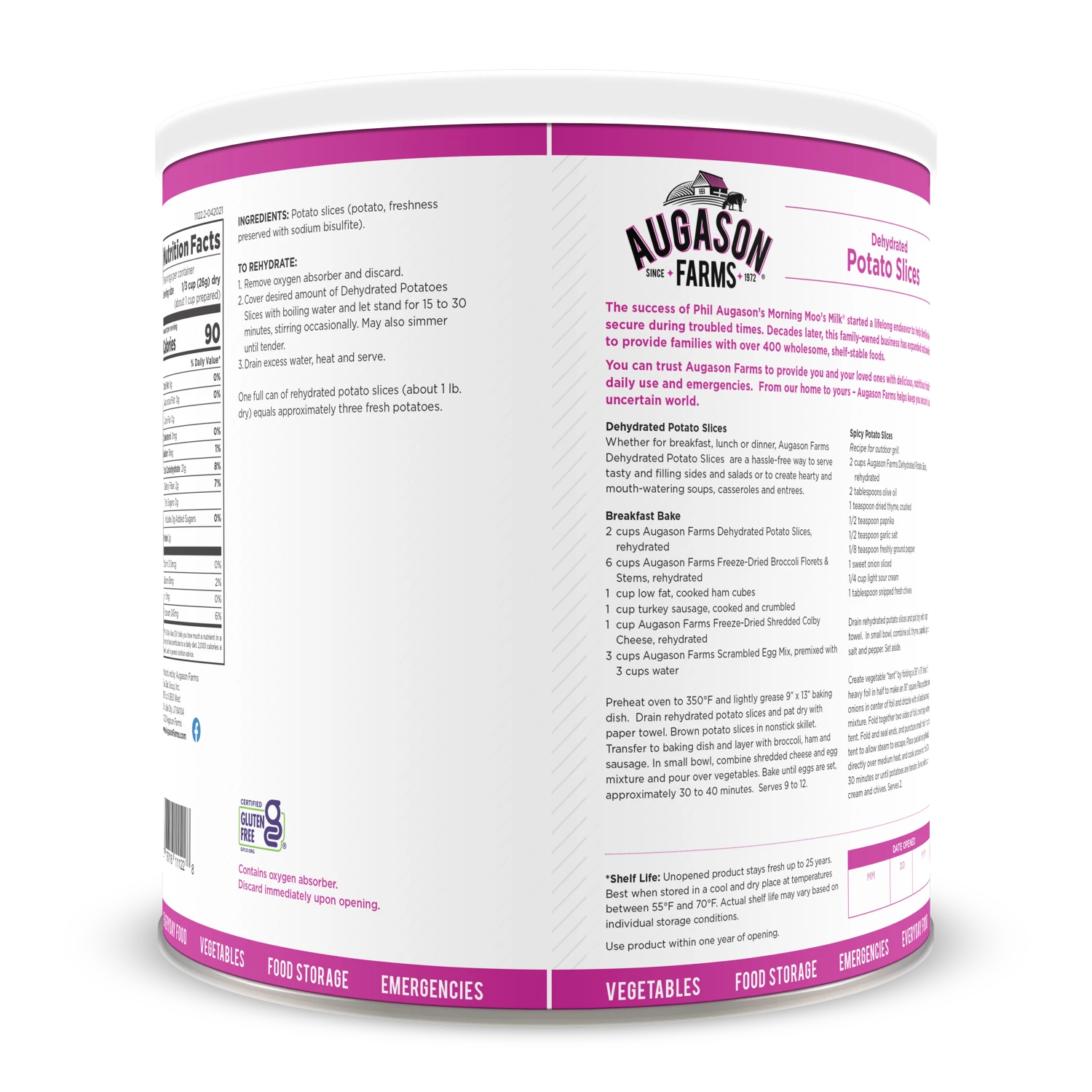 Dehydrating food is something Augason Farms knows a lot about. Their Dehydrated Potato Slices easily combine with other Augason Farms dehydrated vegetables to provide a nutritious, great tasting meal. Augason Farms Dehydrated Potato Slices are a great addition to any family’s survival food storage. Potato Slices are certified gluten free.