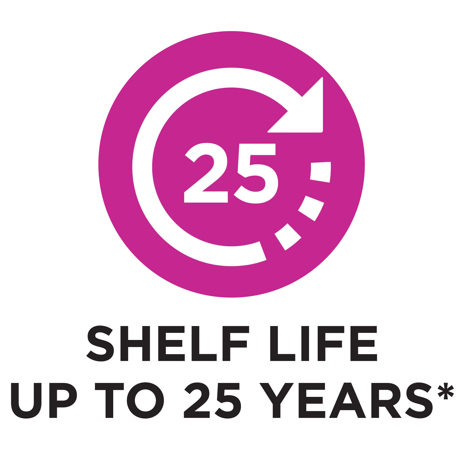 *Shelf life up to 25 years when unopened. Best when stored in a cool and dry place at temperatures between 55°F and 70°F. Actual shelf life may vary based on individual storage conditions.