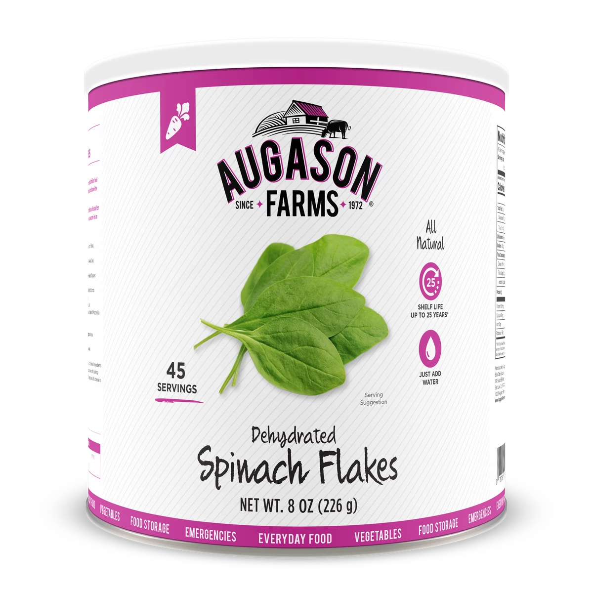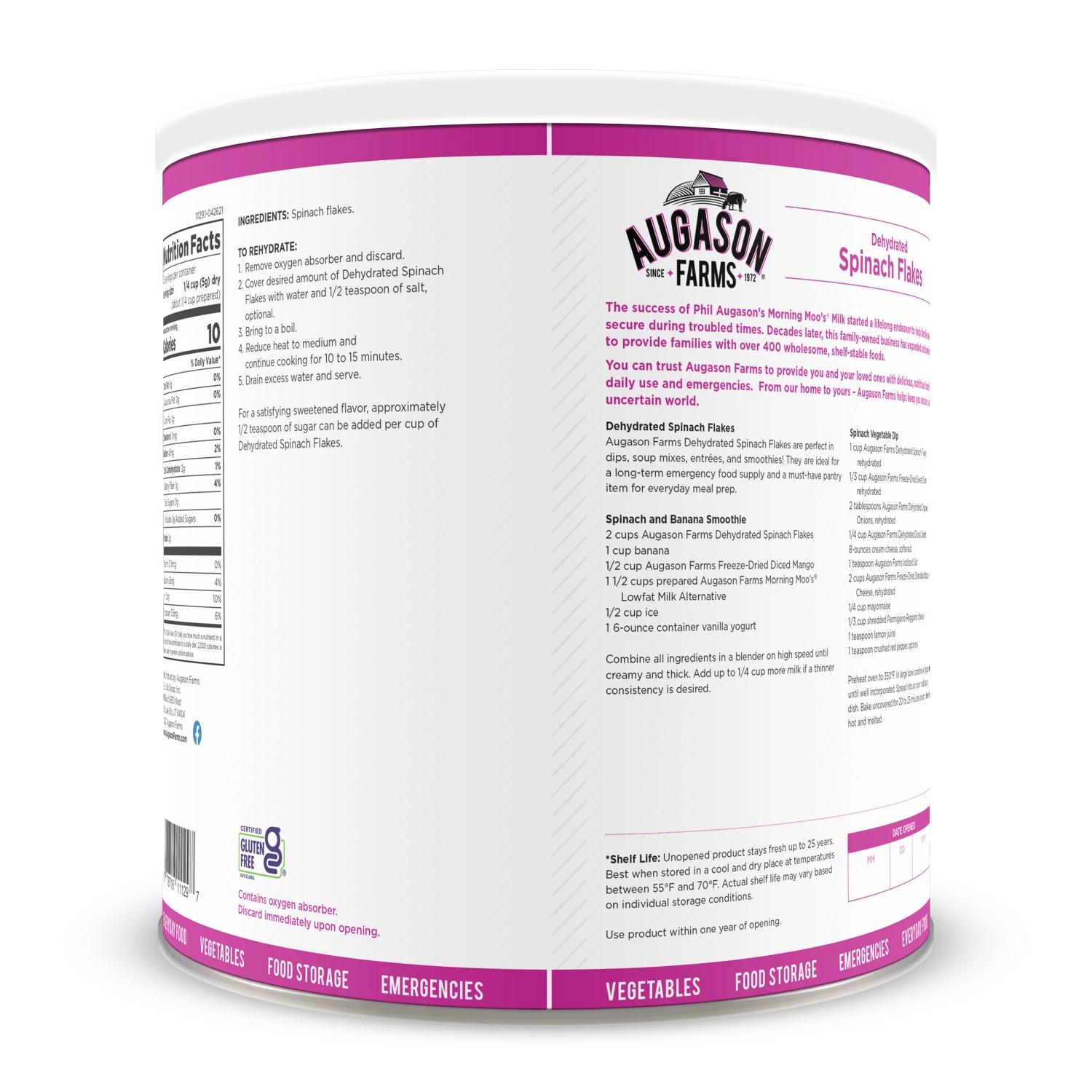 Once rehydrated, Augason Farms Spinach Flakes can be added to dips, soup mixes, vegan entrees, and pasta dishes. Just add the indicated amount of water, bring to a boil, simmer, and use as your recipe directs. Certified gluten free.