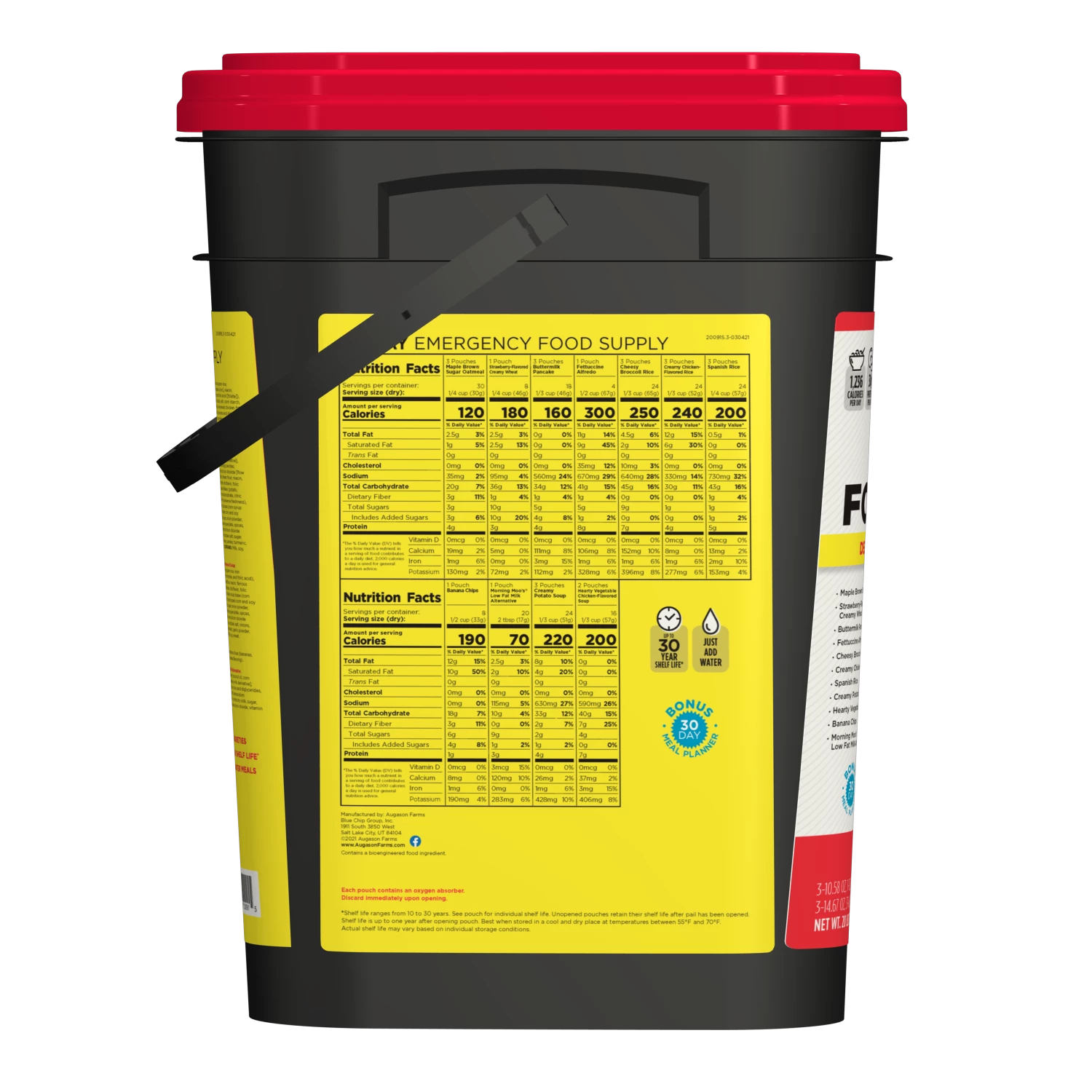 The kit includes 11 varieties of foods to choose from and a total of 36,600 calories. This equates to 1,220 calories per day which aligns with national health organizations’ average recommended daily calorie intake of 1,200. So, you’re covered with nutritious calories (not the empty calories you’ll find with other emergency food brands), flavorful meals and plenty of variety—all packaged in 1 convenient stackable 5-gallon pail.