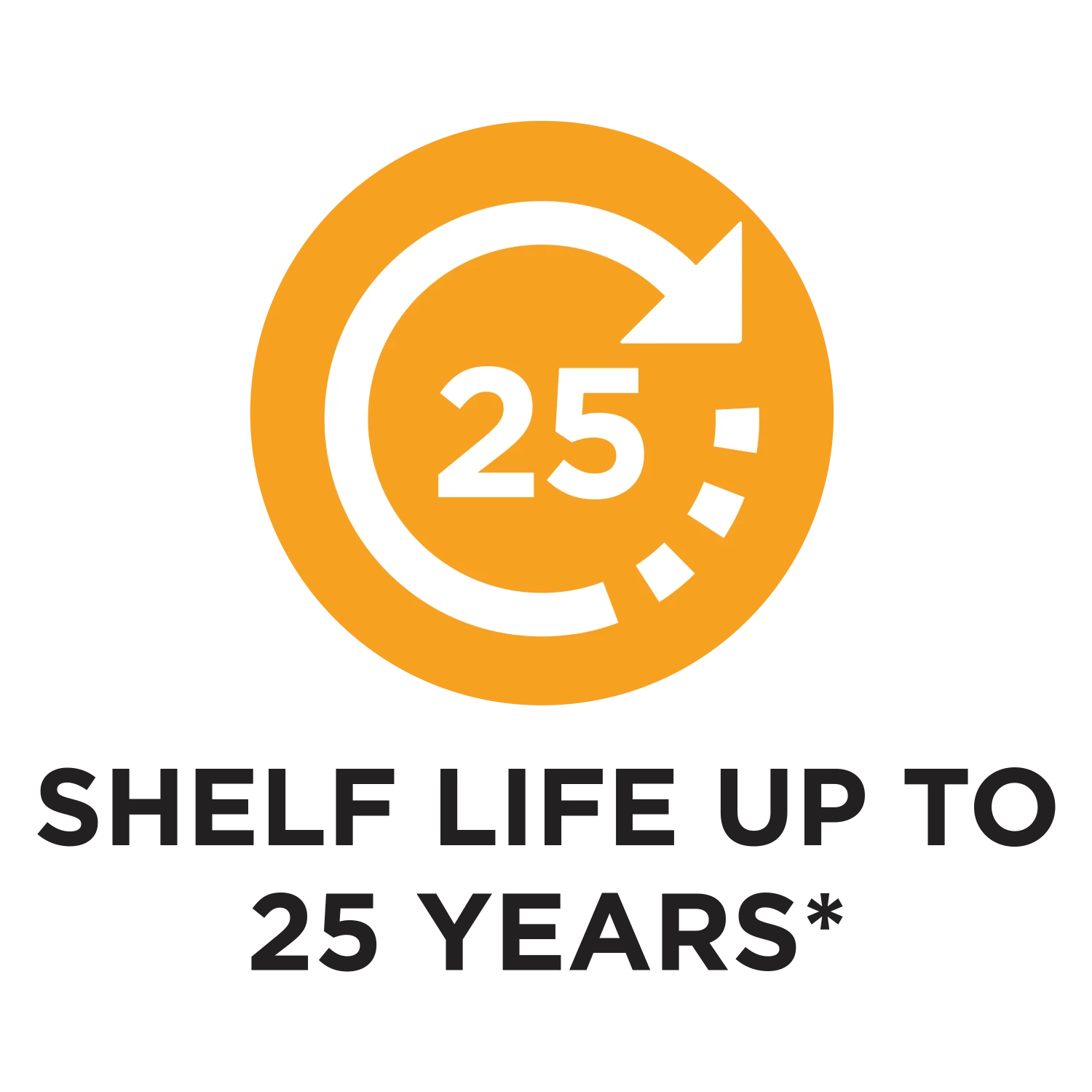 Shelf life ranges from 10 to 20 years based on food type. Unopened products included within a kit retain their shelf life after kit container is opened. Best when stored in a cool and dry place at temperatures between 55°F and 70°F. Actual shelf life may vary based on individual storage conditions.