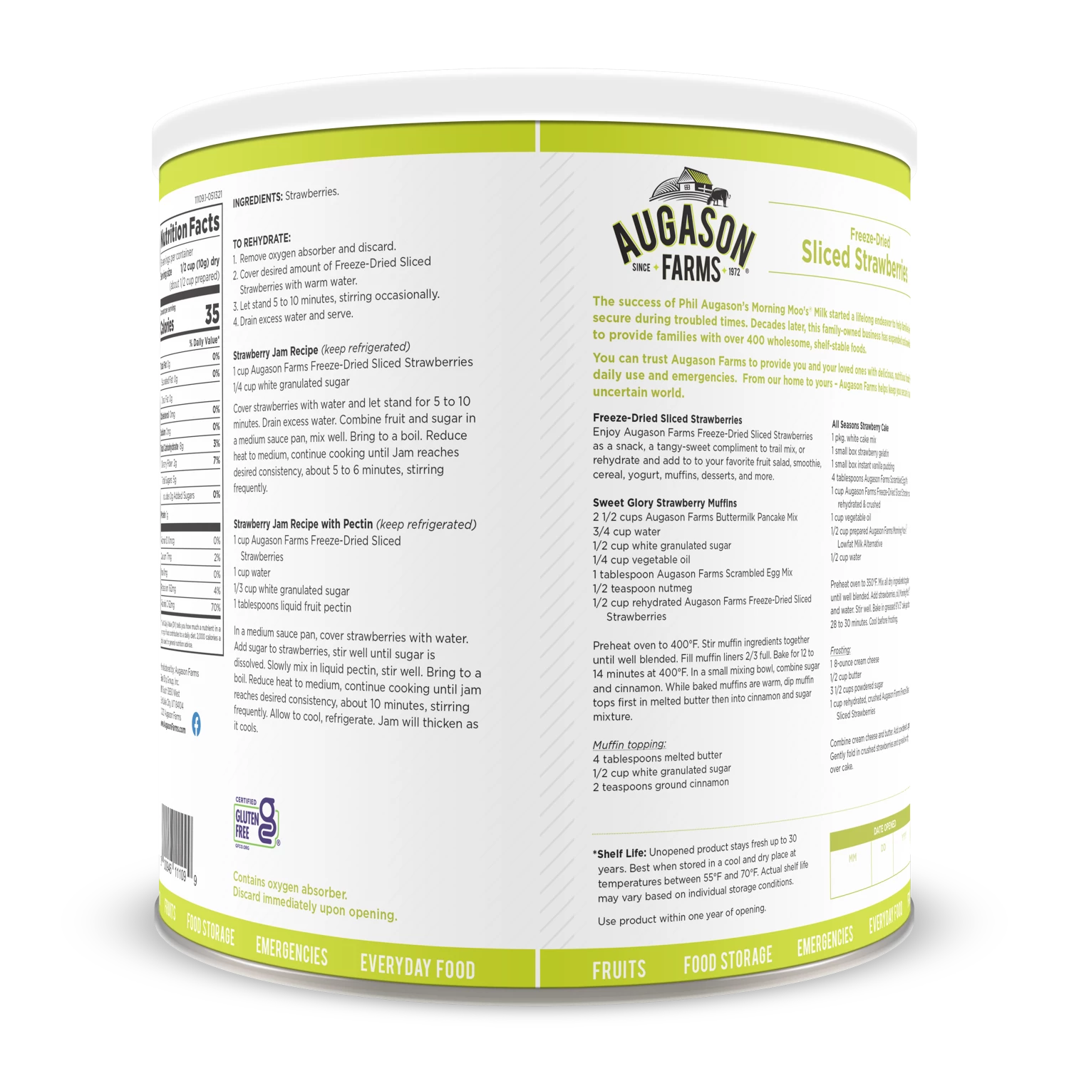 Augason Farms Freeze Dried Sliced Strawberries are packed with Vitamin C and can be enjoyed as a snack right out of the can or added to your cold cereal or hot oatmeal for natural sweetness. You can also reconstitute them with a little water and use in your strawberry shortcake, strawberry milkshake or to top off a strawberry torte.