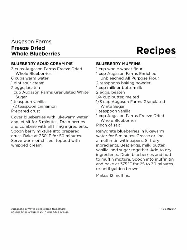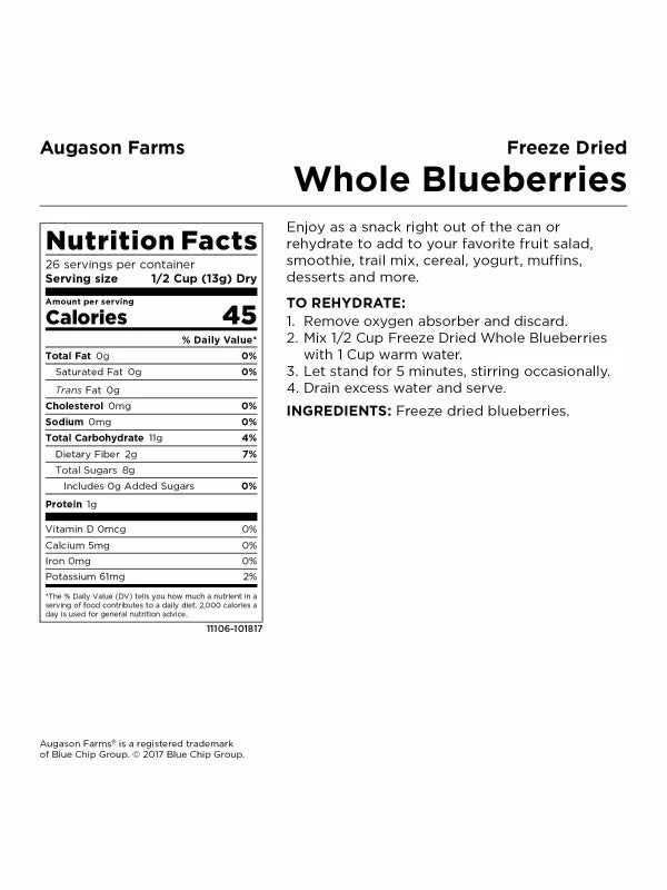 Augason Farms offers a variety of healthy freeze dried fruits you will be excited about, like these scrumptious Freeze Dried Whole Blueberries. Rehydrate them with a little water and enjoy them in pancakes, muffins, cheesecake or to add flavor to your granola. They’re also great for 72 hour kits and long term food storage.