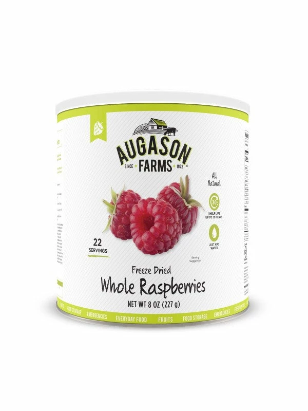 Augason Farms Freeze Dried Whole Raspberries are full of flavor, antioxidants and vitamin C. These raspberries have a fresh, perfectly tart taste great for snacks or use in your emergency food supply. You can add this freeze dried fruit to your favorite breakfast meals or add them to desserts like raspberry white chocolate cookies or raspberry dusted fudge.
