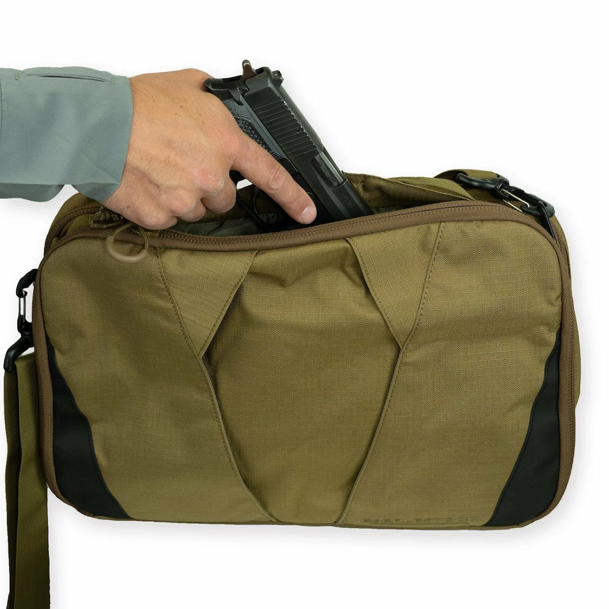 Perfect for your iPad, a 15″ laptop, documents, and all of your pens and personal gear. And most importantly it has a discreet hidden concealed-carry holster tapered pocket that’ll hold any handgun from compact to full-frame automatic in a predictable, easy-access place. The pocket is held closed by hidden magnets, and if a person didn’t know its there they wont be likely to notice it. When you’re traveling this is also a great place to stash your passport. The briefcase, perfected.