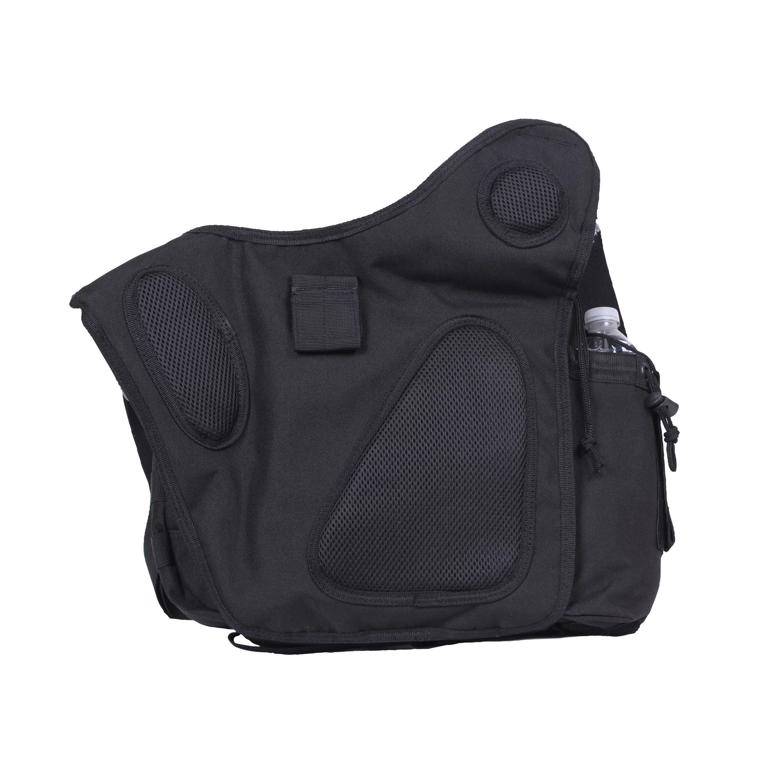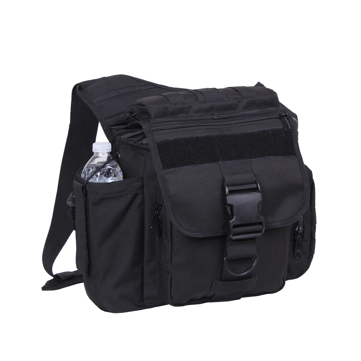 Rothco’s XL Advanced Tactical Shoulder Bag is made of durable denier polyester. The MOLLE compatible tactical shoulder bag features 5 versatile pouches: a small zippered side pouch, top zippered pouch, front zippered pouch, large side pouch with drawstring closure, and exterior cell phone pouch. This tactical shoulder bag has a 2” wide adjustable padded shoulder strap with a quick-release buckle and 2 inside pockets. These survival bags also feature 2 pen holders and three padded areas on the back of the bag.