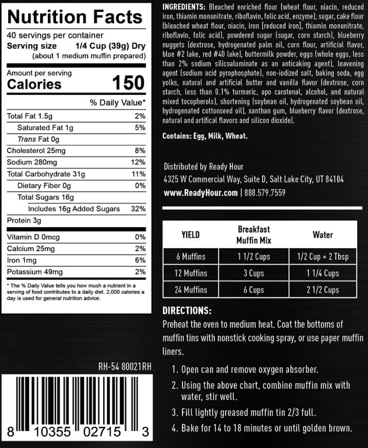 - Ready Hour Breakfast Muffins lasts up to 10 years unopened, and one year once it is open.