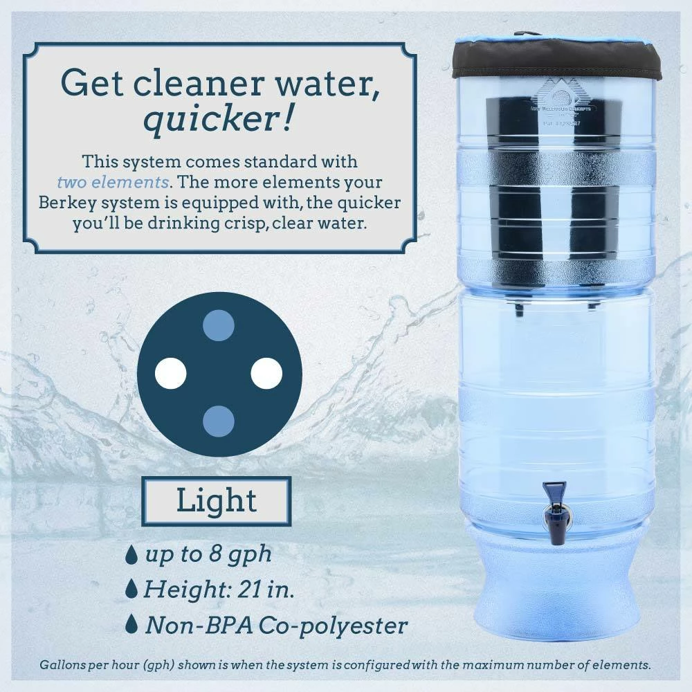 - This Berkey Light System comes standard with 2 Black Berkey Purification Elements but can be expanded up to 4 elements