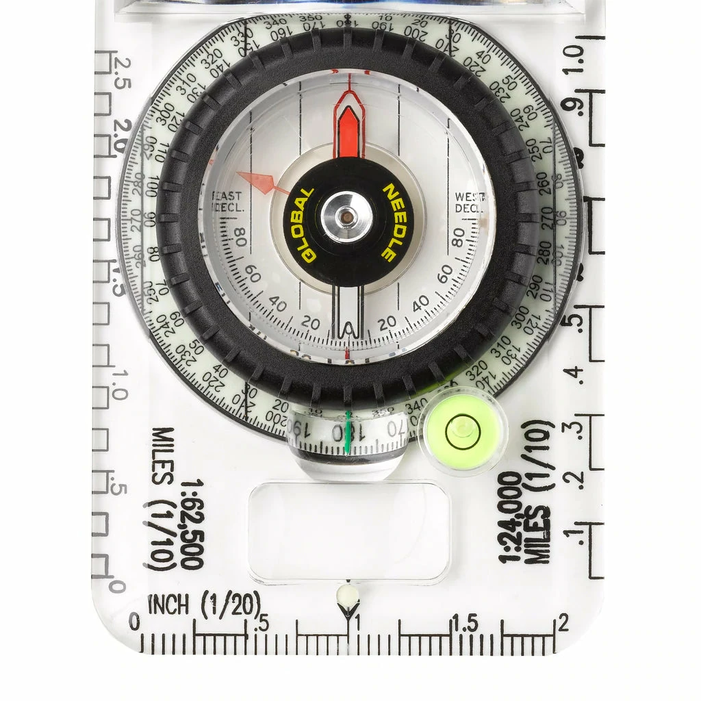 - Bubble level for absolute precision readings; keeping the compass level (not the needle level) is a critical aspect for taking an accurate bearings