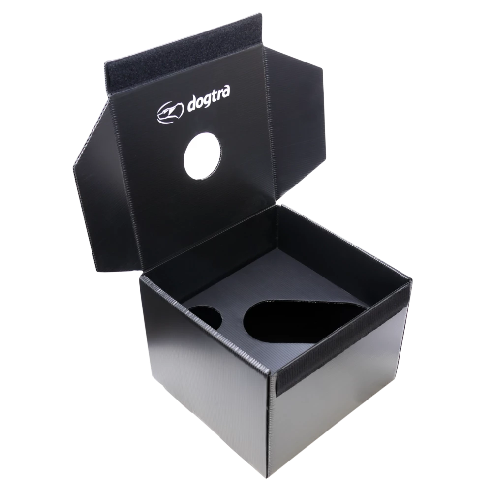 Light weight and durable, the Dogtra Training Box is made out of fluted polypropylene sheets to provide the least distracting material odor. Its light weight and durable structure allows for versatility and portability during and after detection training sessions. The top cutout is placed perfectly for the launcher part of the Dogtra BALL TRAINER.
