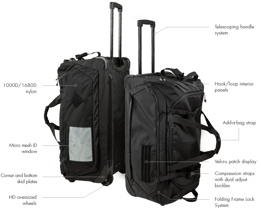The Specialist Rolling Duffel is amongst the most durable bags on the market. Oversized, flat wheels are perfect for rolling over debris and rubble, reinforced corners protect the high abrasion areas, and a thick handle system is strong enough to bear heavy tactical loads.
