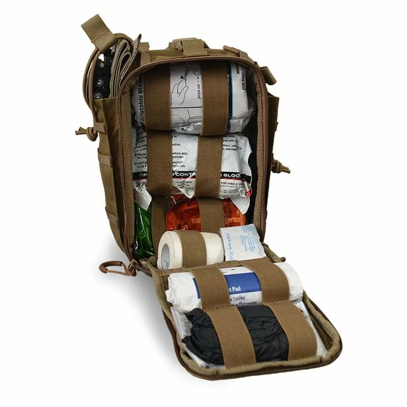 The A2FK IndiTAK (Individual Trauma Aid Kit) is outfitted with elastic bands to hold essential items in a first-rate IFAK trauma kit such as bandaging, tourniquets, etc.. The A2FK features a full-frontal view pouch that incorporates two external tourniquet sleeves which double as 5.56 mag pouches. It has a tear-away MOLLE back which allows it to be mounted to a pack, to other Velcro mating surface, or simply transferred to a waist belt.