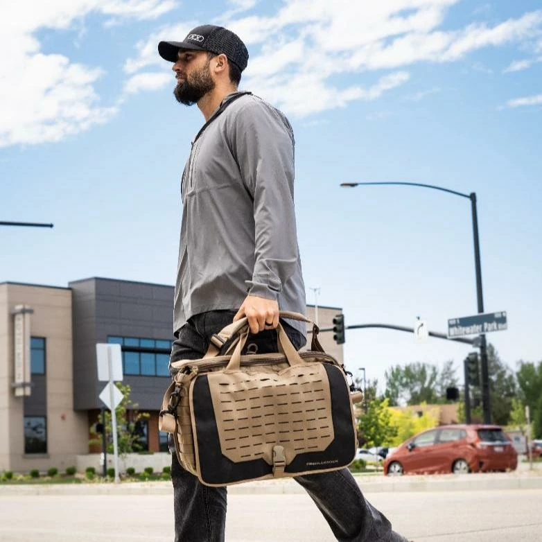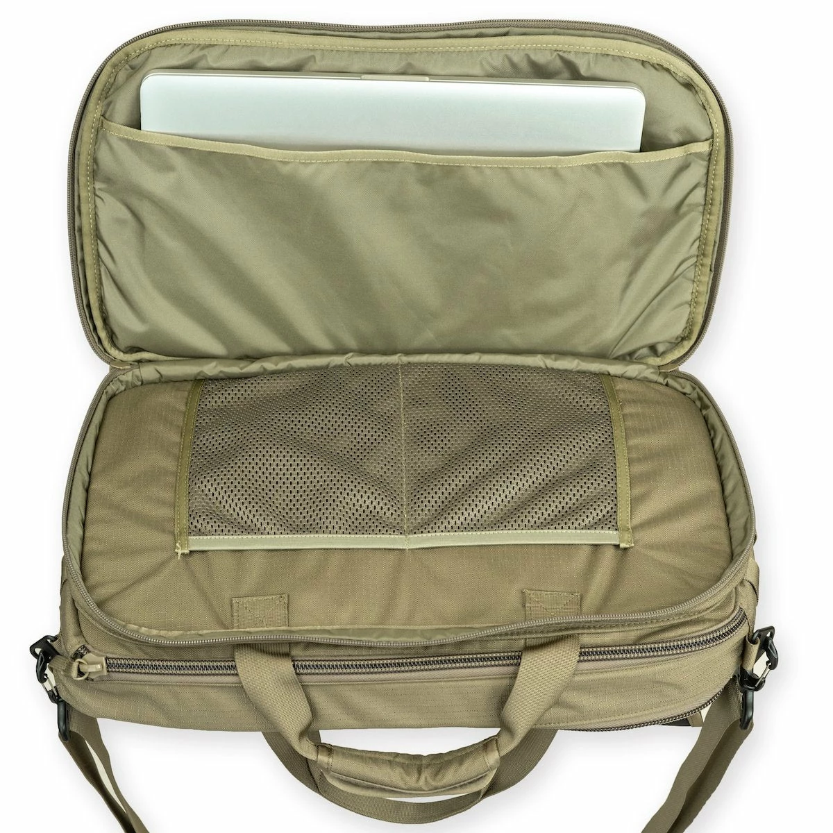 A tandem zipper easily opens the barn-door top, revealing a generously sized main compartment. An adjacent laptop compartment comprises the bulk of the remaining interior volume. On the back-side of the bag, an open-topped document pocket has a zipper at its bottom, which allows you to slip the B1 securely onto the handle of your rolling suitcase. The laptop pocket has full-zip-down pockets, allowing the bag to be split open for TSA x-rays without completely removing your laptop from the bag. The bag is scaled to be not-too-big, but not-too-small, making it a perfect every-day carry about for your laptop and all of your gear. Topping it off, the B1 is probably the best conceal-carry bag ever invented, with a discreet magnet-closure pocket for your handgun.