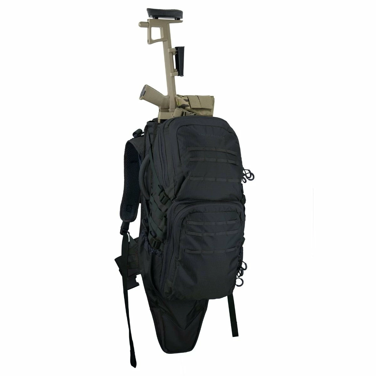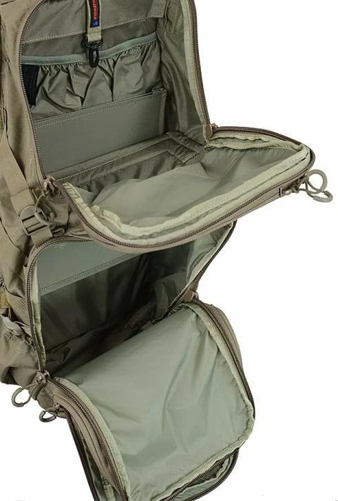 The interior includes a hydration sleeve for the WX2L and WXP3L hydration systems (sold separately), two document / laptop sleeves, a mesh zippered pocket, MOLLE compatible webbing, and a fold-away shelf that allows you to either segregate or combine the top and bottom interior load space. Built in 420 denier ripstop nylon. Comes with our polycarbonate Gossamer frame, which can be interchanged with the aluminum Intex II frame (sold separately).