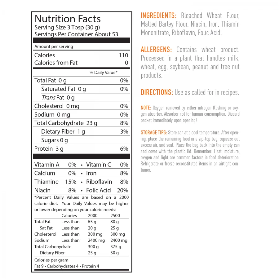 Emergency Essentials White Flour is packaged for long-term storage, so you can use it now or in the years ahead. An essential addition to your emergency food storage. Use to make your favourite breads, pastries, desserts, or in any recipe that calls for flour. An excellent source of thiamine, and a good source of iron and folic acid.