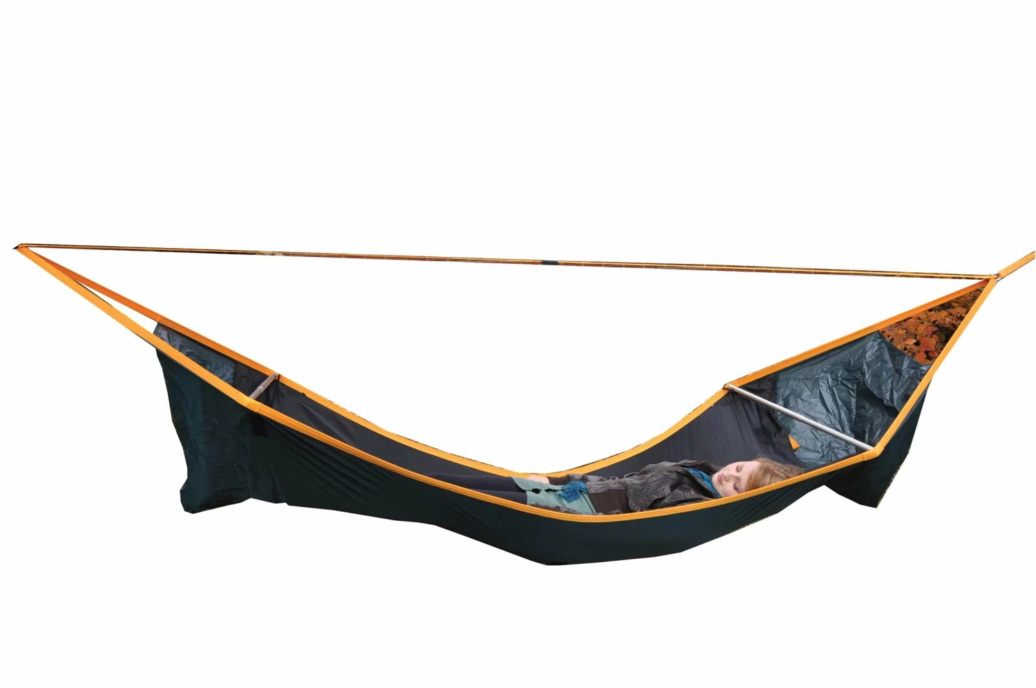 Combining the comfort of sleeping in a hammock with the functionality of a tent offering protection from rain and insects, the Chrysalis Camping Hammock Tent features a patented two-pole design that’s easy to set up and stable for a comfortable night’s sleep. The Chrysalis sets up or breaks down in just minutes without touching the wet or muddy ground — no stakes, tarps, flies or tie downs. Simply secure the wide web straps to two trees or other stable structures.