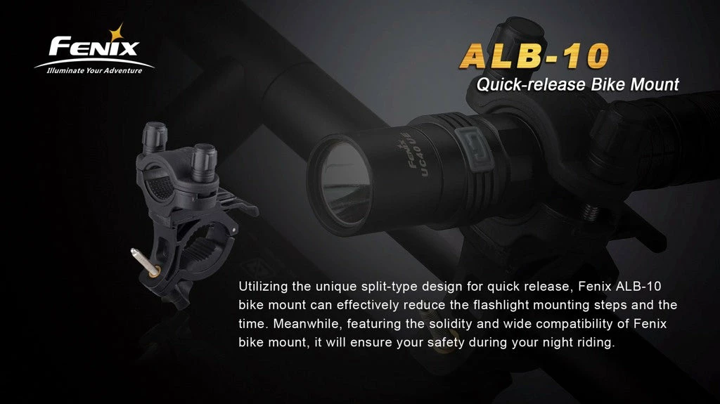 Utilizing the unique split-type design for quick release, the Fenix ALB-10 bike mount can effectively reduce the flashlight mounting time. Meanwhile, featuring the solidity and wide compatibility of Fenix bike mount, it will ensure your safety during your night riding.