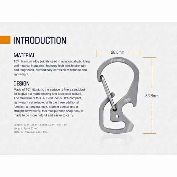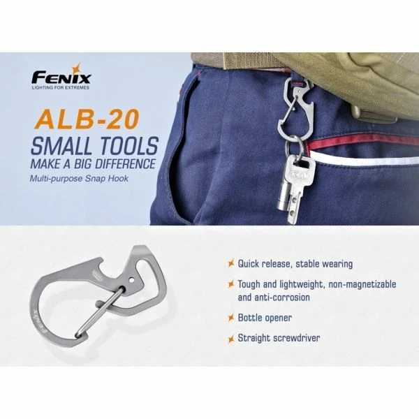 The Fenix ALB-20 is carabiner-style clip made from hard-wearing TC4 titanium alloy. The snap-hook incorporates a bottle opener and straight screwdriver and can be attached to your clothing or accessories using the key ring.