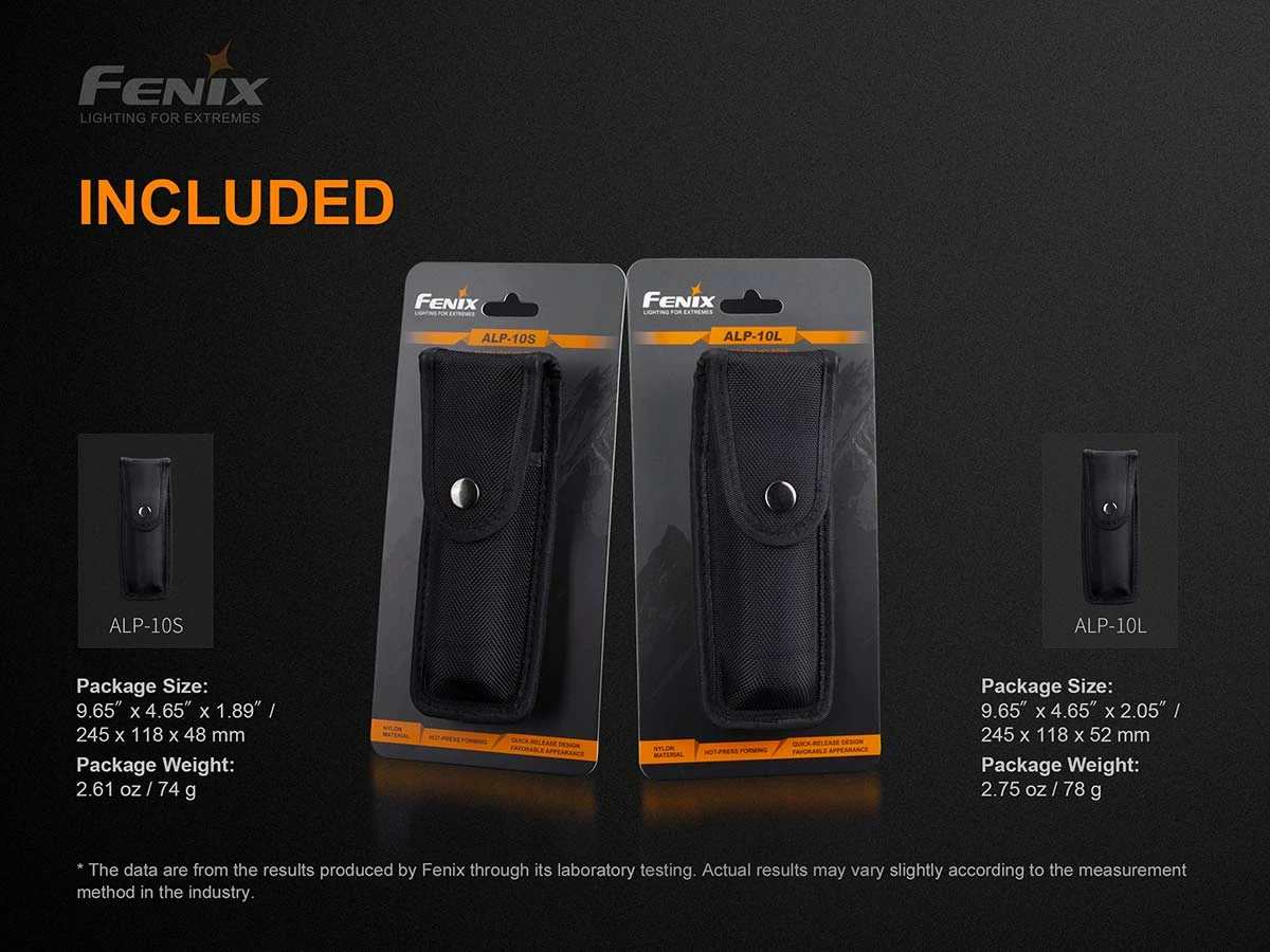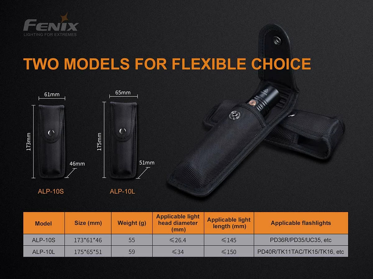 The Fenix ALP-10 Tactical Pro Tactical Flashlight Holster offer a very tough, professional holster, perfect for law enforcement and tactical applications. Made from hot-pressed nylon, the service life of this holster is 10 times longer than other materials—extremely strong and scratch resistant. The back webbing is equipped with Velcro and a nickel-plated button ensuring a strong hold, but also the ability to quickly release the holster from your pack or duty belt. Two sizes allow for a perfect fit for your Fenix flashlight.