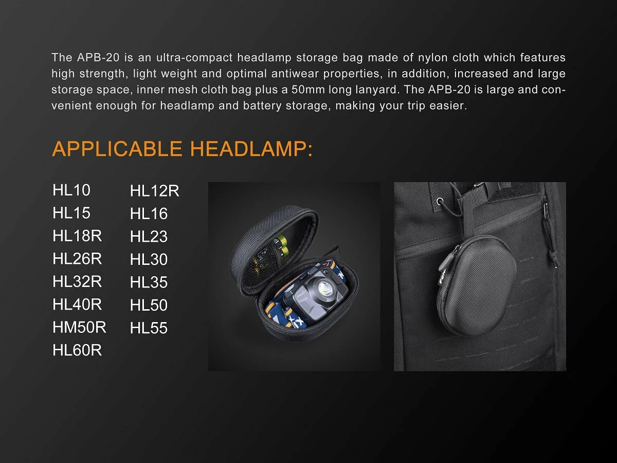 The Fenix APB-20 is an ultra-compact nylon storage bag that will fit most Fenix headlamp models. The Fenix APB-20 is made from durable nylon cloth, making it very sturdy and lightweight. With its inner multipurpose storage pocket this bag will help keep your batteries, cords and headlamp all in one place perfect for camping, hiking, or traveling.