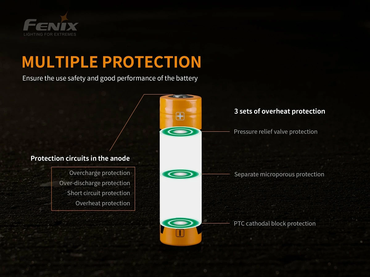 The Fenix ARB-L21-4000P is a High Capacity / High Draw 21700 Li-ion rechargeable battery with a protection circuit in the anode to help prevent short circuits, over charge/discharge and over heating. The battery also includes pressure relief vents which expel waste gas in the rare case of an internal short circuit.