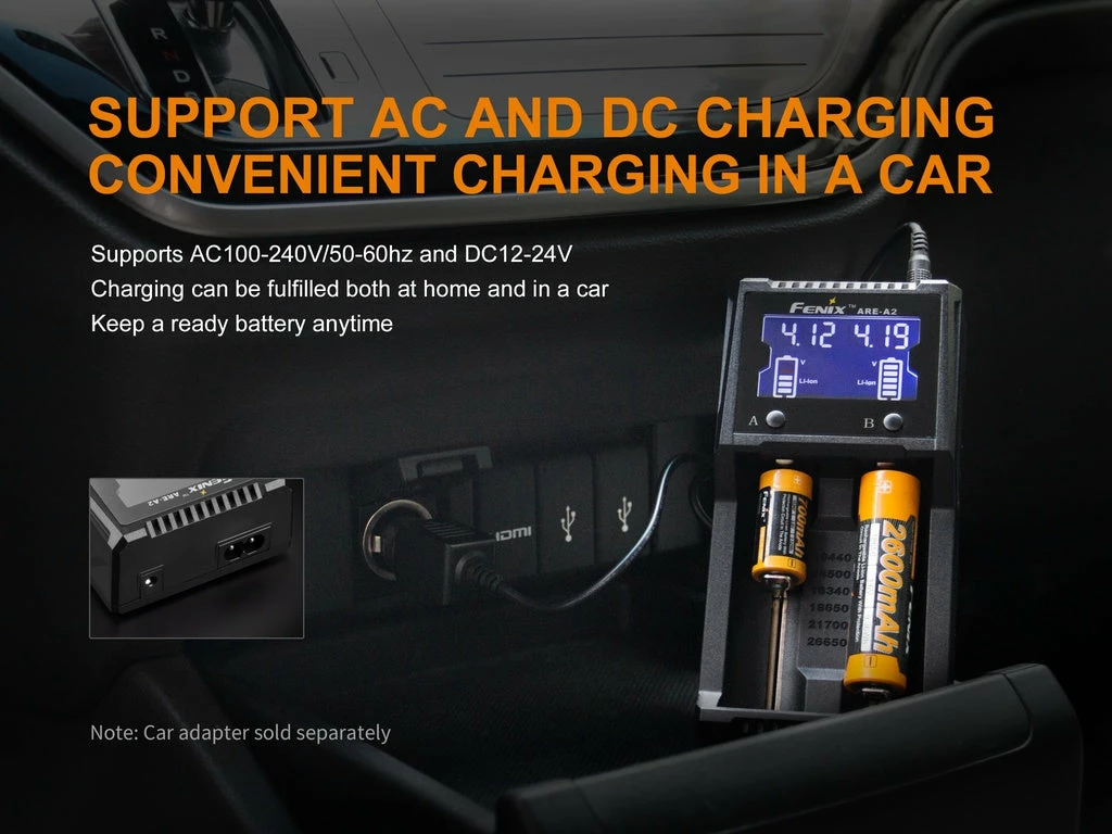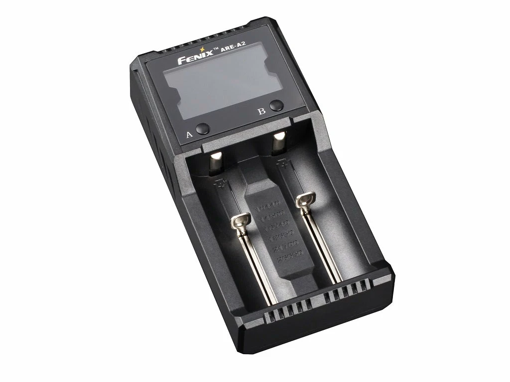 Never run out of power with the new Fenix ARE-A2 dual-channel battery charger. This upgraded battery charger can effortlessly charge 10440, 14500, 16340, 18650, 21700 and 26650 batteries. The Fenix ARE-A2 has a multiple protection design that includes short-circuit protection, over-current protection, over-voltage protection, and reverse polarity protection. You can easily view battery details on the bright LCD battery charger display. Single clicks will cycle through the voltage, charging current, and charging time details. A long press on the button will turn off the LCD screen. You can also charge your batteries on the go with the DC 12-24V car adapter (sold separately). Be ready to charge any your flashlight batteries with the new Fenix ARE-A2 dual-channel battery charger.