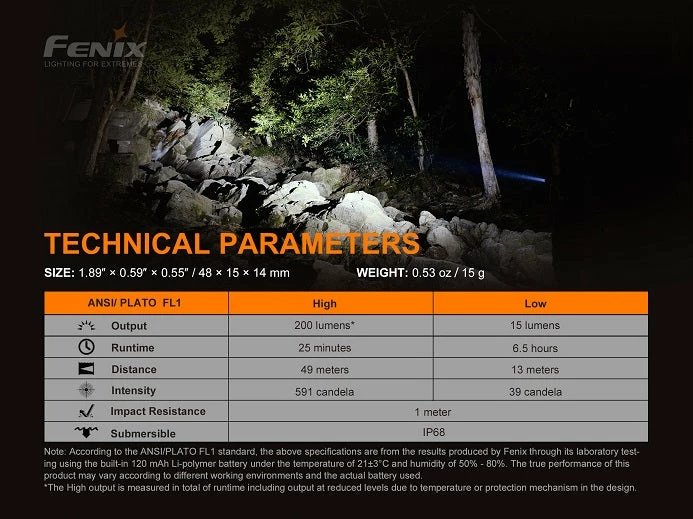 - Low – 15 Lumens / 6.5 Hours / 13m