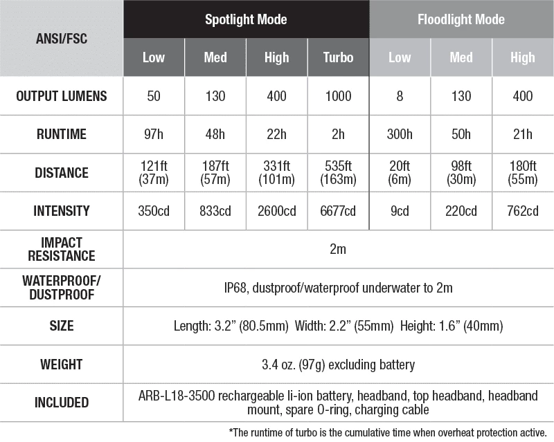ARB-L18-3400 rechargeable li-ion battery, headband, top headband, headband mount, spare O-ring, USB Type-C charging cable