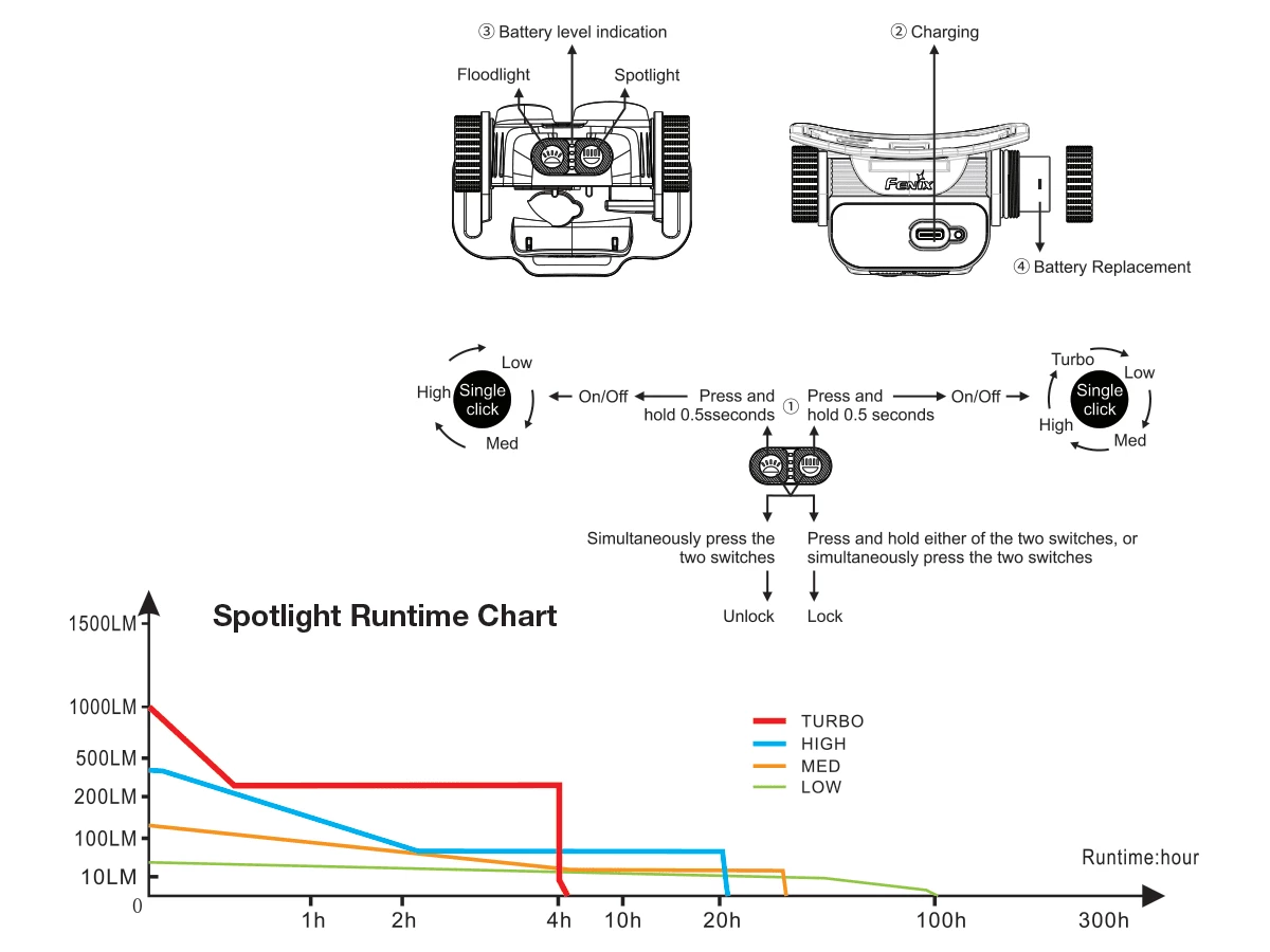 - Ability to use spot and floodlights independently or at the same time