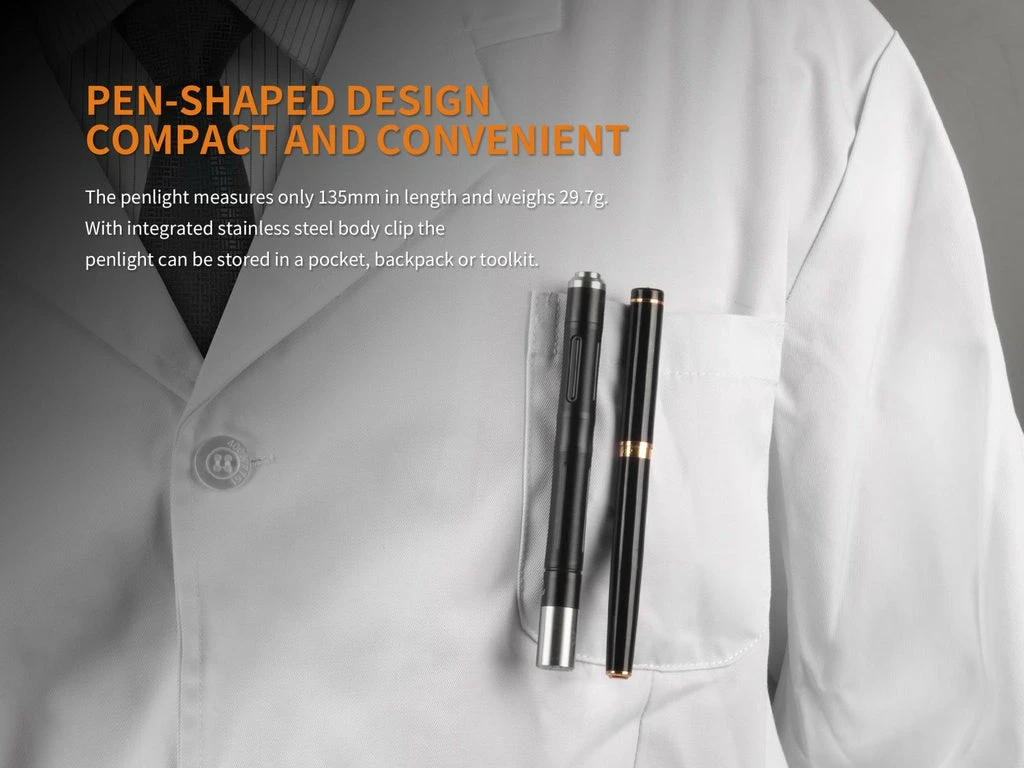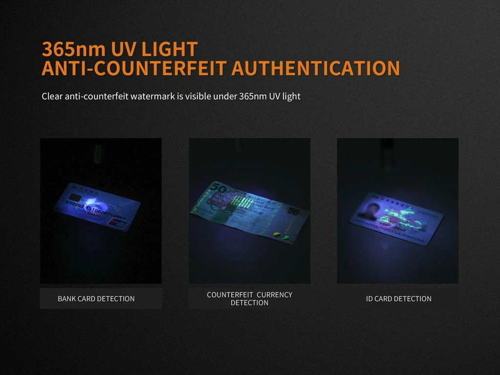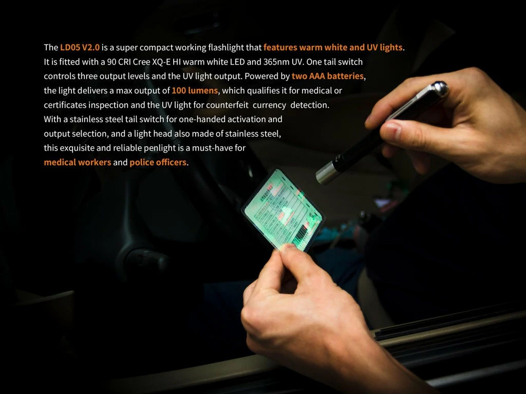 Fenix LD05 V2.0 is a super compact working flashlight that features warm white and UV lights. It is fitted with a 90 CRI Cree XQ-E HI warm white LED and 365nm UV. One tail switch controls three output levels and the UV light output. Powered by two AAA batteries, the light delivers a max output of 100 lumens, which qualifies it for medical or certificates inspection and the UV light for counterfeit currency detection. With a stainless steel tail switch for one-handed activation and output selection, and a light head also made of stainless steel, this exquisite and reliable penlight is a must-have for medical workers and police officers.