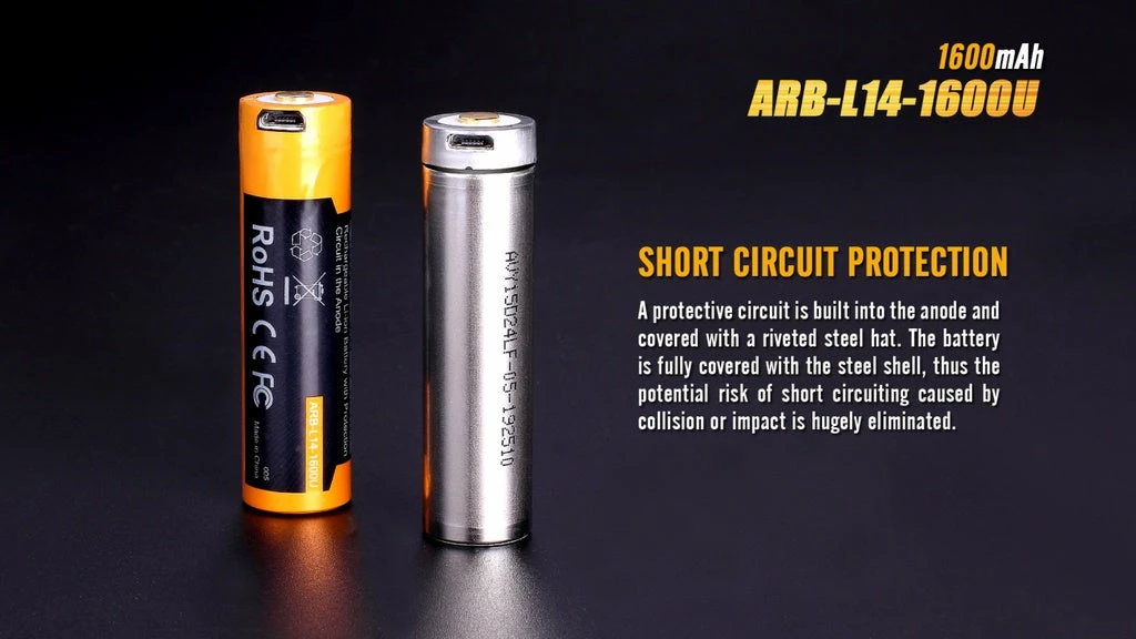 The ARB-L14-1600U 1.5V battery can be charged by its own USB port only. A protective circuit is built into the anode and covered with a riveted steel hat. The battery is fully covered with the steel shell, thus the potential risk of short circuiting caused by collision or impact is hugely eliminated.