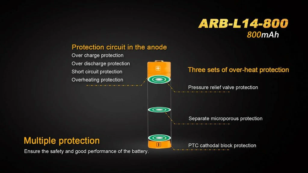 The protection circuit is built in the anode with a steel hat by riveting process. So the Fenix ARB-L14-800 can be fully covered with steel shell and eliminate potential risk of short circuit caused by collision and impact.