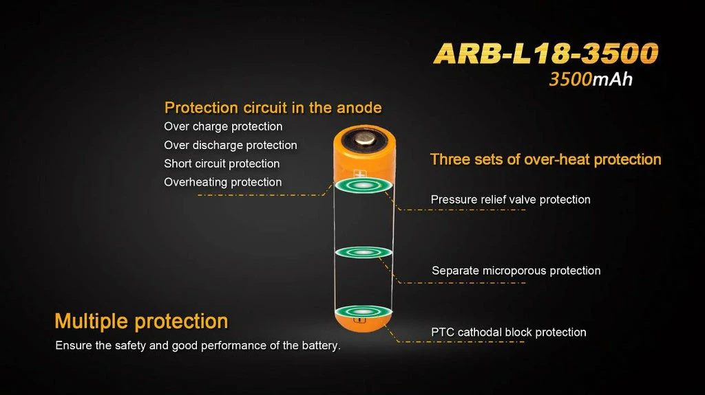The Fenix ARB-L18-3500 is a high capacity 18650 Li-ion rechargeable battery with a protection circuit in the anode to help prevent short circuits, overcharge/discharge and overheating. The battery also includes pressure relief vents that expel waste gas in the rare case of an internal short circuit preventing an explosion.