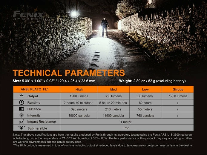 • High – 1200 lumens – 2 hr. 40 min. – 1295 ft. beam