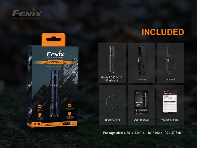 The upgraded Fenix PD32 V2.0 LED flashlight is an all-round flashlight with a compact body. This high-performance light illuminates your way with 1200 max lumens from one 18650 Li-ion battery or two CR123As. Choose between three brightness levels and strobe with a maximum beam distance of 395 meters. Tap and hold the multifunctional tail switch for a fast momentary on and press the tail switch to access the different modes with a single hand. The PD32 V2.0 LED flashlight is perfect for hiking, camping and outdoor activities and is powerful enough for law enforcement or search and rescue.