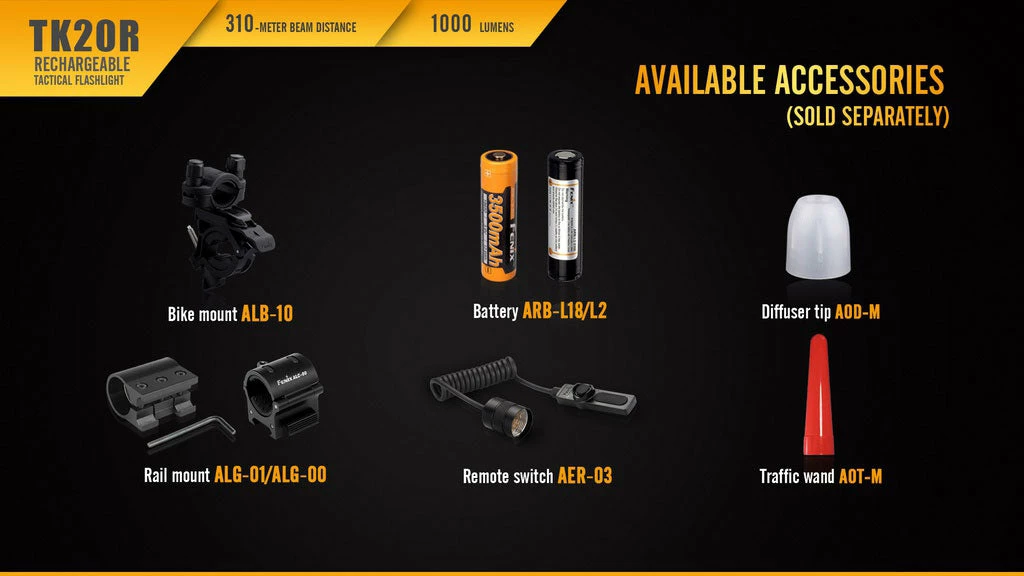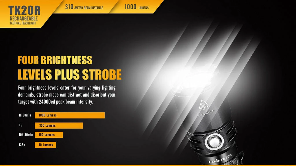 Fenix TK20R is a Micro-USB rechargeable flashlight that is designed for tactical applications. It delivers a maximum beam distance of 310 meters by utilizing a CREE XPL HI V3 LED, and has a max output of 1000 lumens. In addition, it is powered by one 18650 rechargeable Li-ion battery, and two cold resistant CR123A can be used as standby batteries. Features are dual layer body, inner waterproofing treatment; and a tactical tail switch and side switch that allow easily access to four output levels and strobe. This compact but hardy flashlight is ideal for tactical application, industrial tasks and hunting.