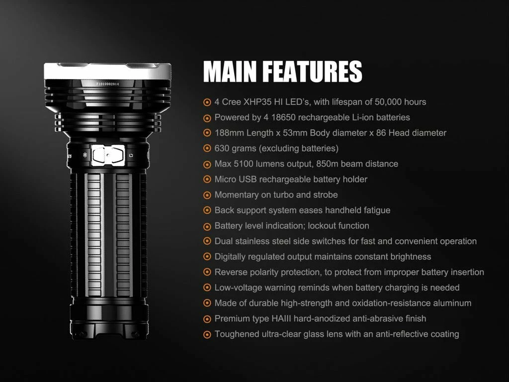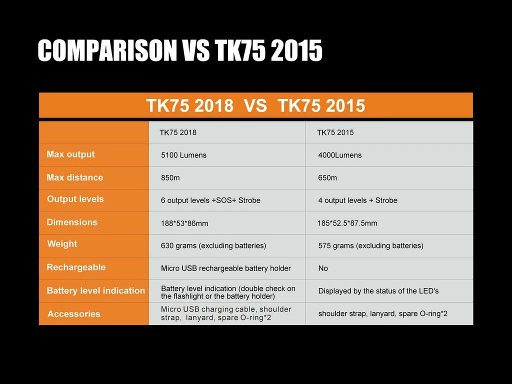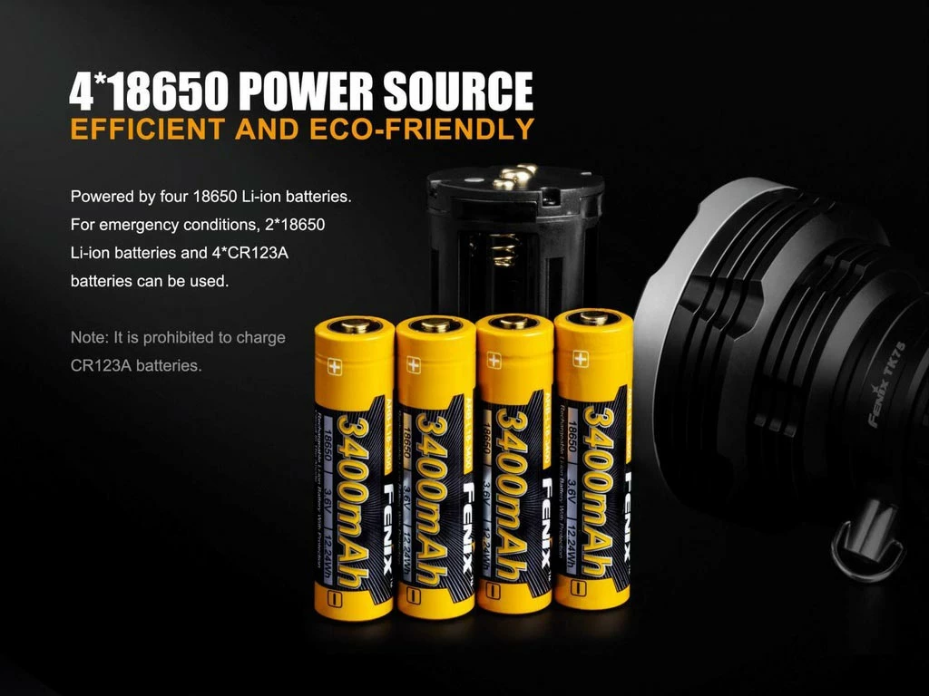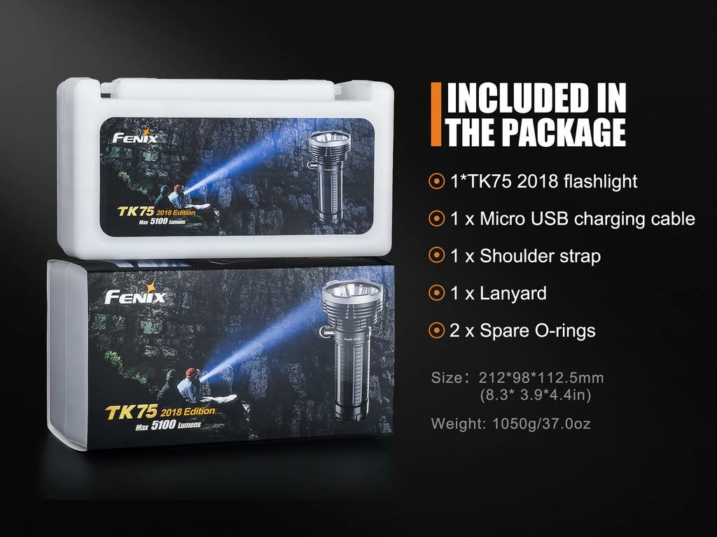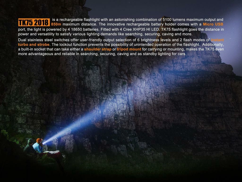 The TK75 2018, is a rechargeable flashlight with an astonishing combination of 5100 lumens maximum output and 850m maximum distance. The innovative rechargeable battery holder comes with a Micro USB port, powered by 4-18650 batteries (any of the 18650 series of batteries are suited well for this flashlight). Fitted with 4 Cree XHP35 HI LED, TK75 flashlight goes the distance in power and versatility to satisfy various lighting demands like searching, securing, caving and more. Dual stainless steel switches offer user-friendly output selection of 6 brightness levels and 2 flash modes. The lockout function prevents the possibility of unintended operation of the flashlight. Additionally, a built-in socket that can take either a shoulder strap or tripod mount for carrying or mounting, makes the TK75 even more advantageous and reliable in searching, securing, caving and as standby lighting for cars.