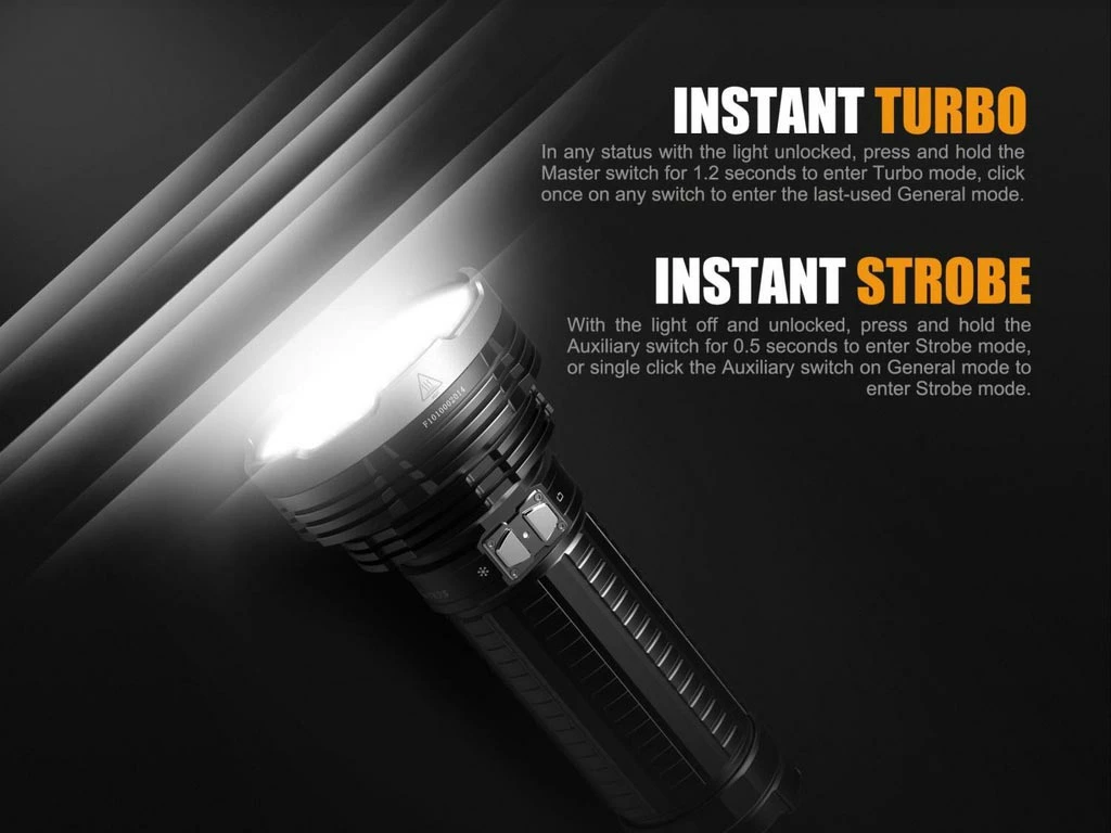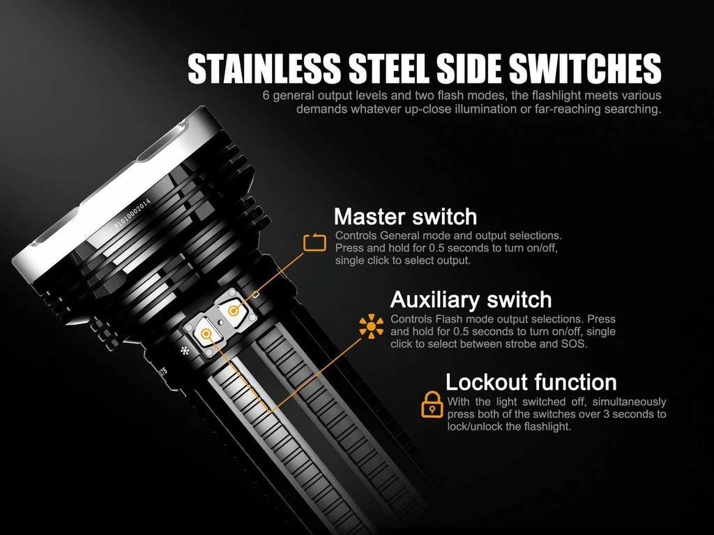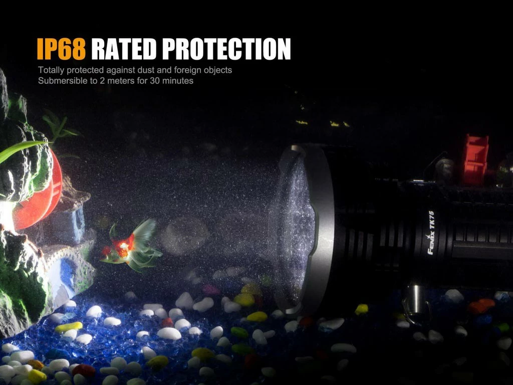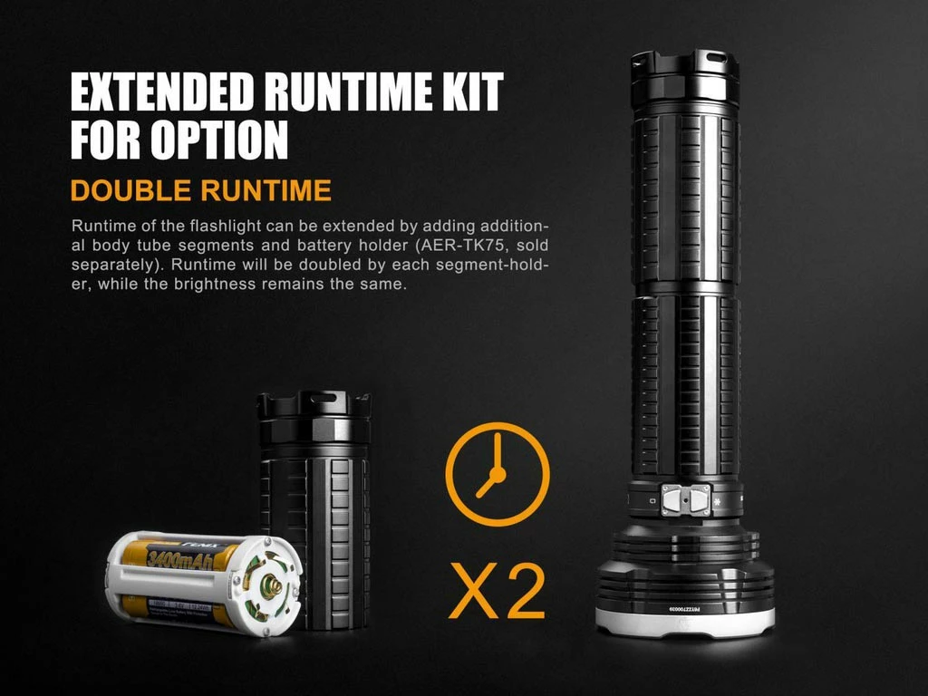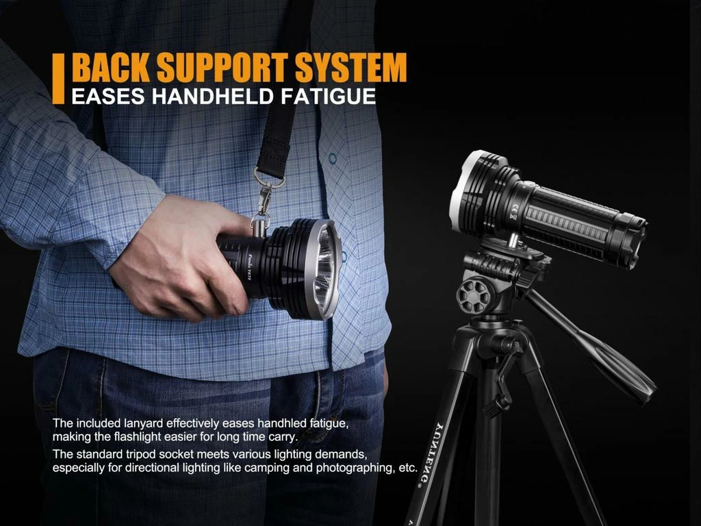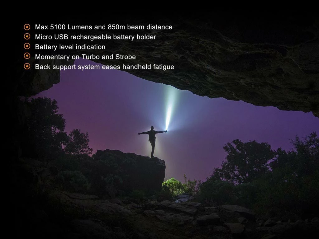 The TK75 2018, is a rechargeable flashlight with an astonishing combination of 5100 lumens maximum output and 850m maximum distance. The innovative rechargeable battery holder comes with a Micro USB port, powered by 4-18650 batteries (any of the 18650 series of batteries are suited well for this flashlight). Fitted with 4 Cree XHP35 HI LED, TK75 flashlight goes the distance in power and versatility to satisfy various lighting demands like searching, securing, caving and more. Dual stainless steel switches offer user-friendly output selection of 6 brightness levels and 2 flash modes. The lockout function prevents the possibility of unintended operation of the flashlight. Additionally, a built-in socket that can take either a shoulder strap or tripod mount for carrying or mounting, makes the TK75 even more advantageous and reliable in searching, securing, caving and as standby lighting for cars.