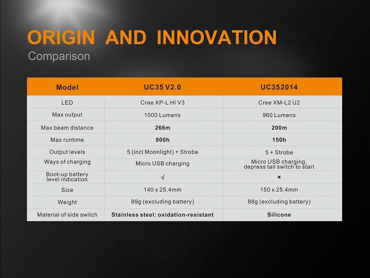The Fenix UC35 V2.0 is a tactical, pocket-sized, compact tactical flashlight featuring micro USB recharging with included 3500mAh battery, exquisite appearance, far-reaching beam and one-handed operation. It is fitted with a CREE XP-L HI V3 LED that delivers an output of up to 1000 lumens and a max distance of 266 meters. One tactical tail switch and one functional side switch control five output levels and strobe mode. Boot-up battery level indication ensures users are well-prepared for their lighting needs.
