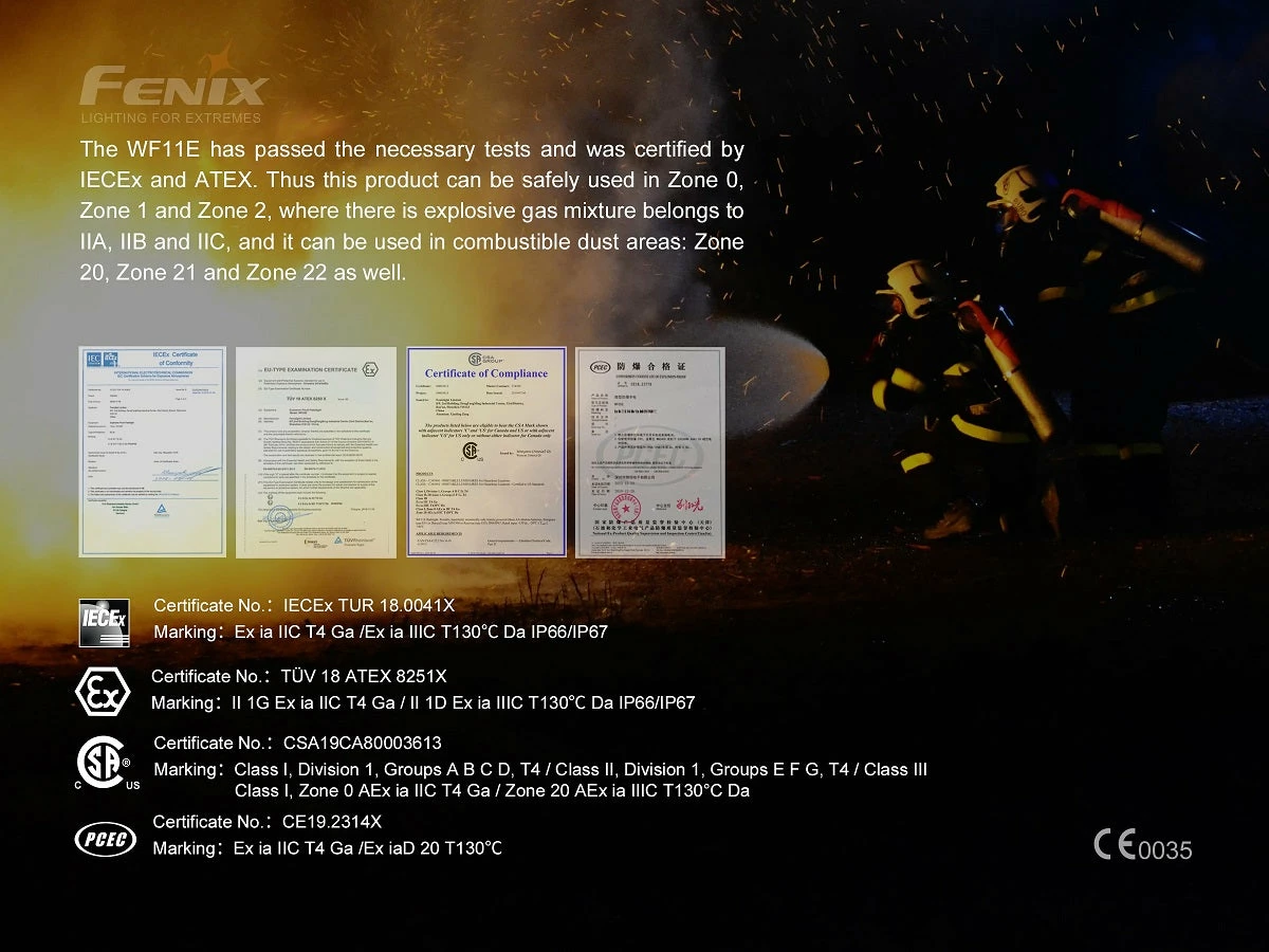 The Fenix WF11E 200 lumen AA battery powered intrinsically safe flashlight with magnetic tail and body clip. Tested and certified by IECEx,ATEX and CSA. IP67 rated submersible up to 1m for 30 min. Cree AP-G2 neutral white led with a lifespan of 50000hrs. Made from explosion-proof and antistatic plastics.