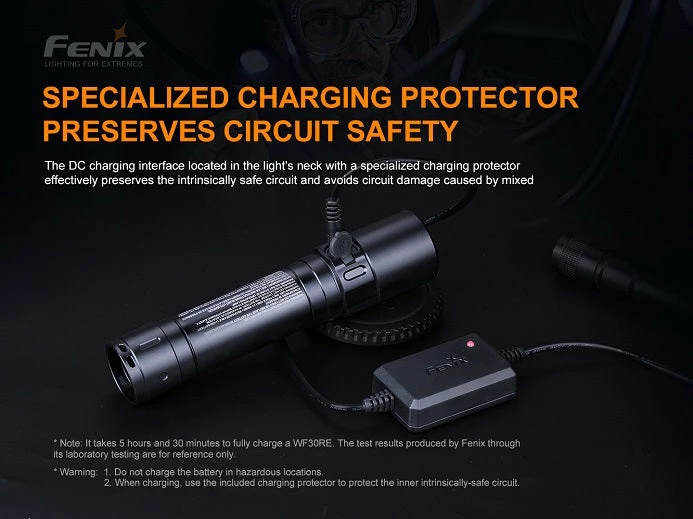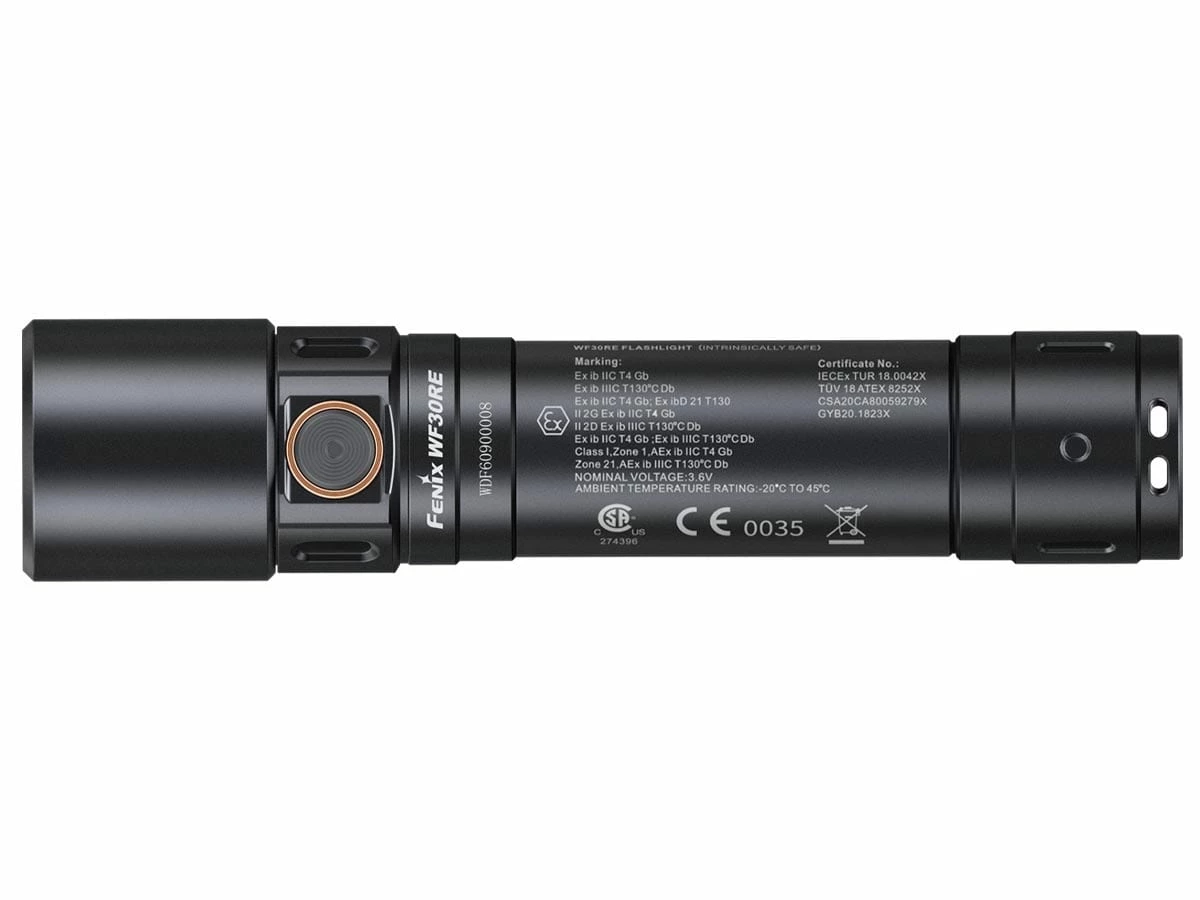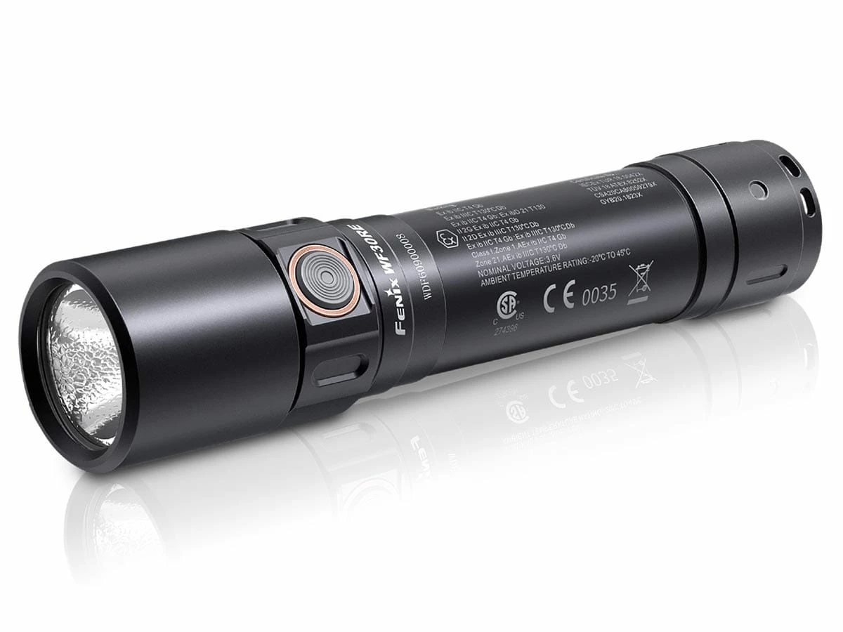 With these certifications, the Fenix WF30R has been proven to be safe in both explosive gas environments and explosive dust environments. This intrinsically safe flashlight has been certified for Zone 1, Zone 2, Zone 21, and Zone 22. This is our first rechargeable intrinsically safe flashlight featuring a simple side switch mode operation with 3 light settings + strobe