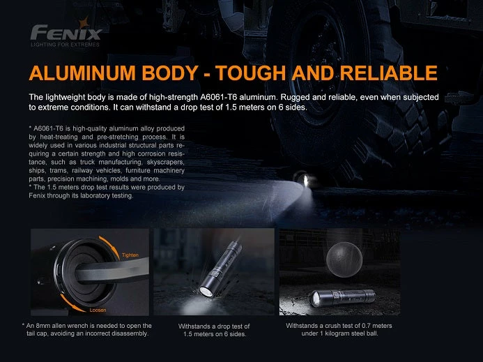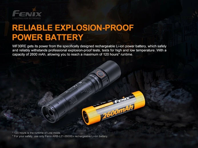 - Powered by one Fenix ARB-L21-2600Ex rechargeable Li-ion battery.