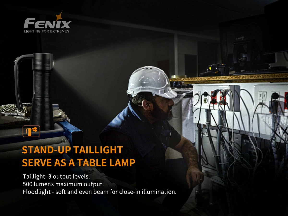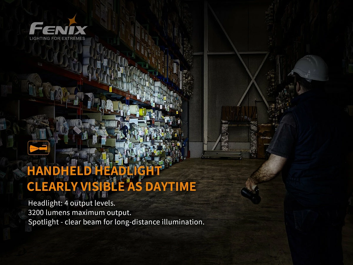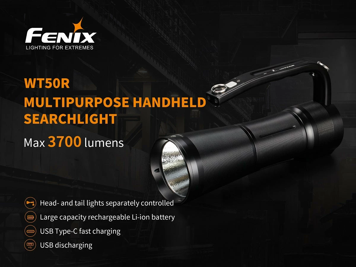 The Fenix WT50R is a multipurpose handheld searchlight which delivers a total max output of 3700 lumens featuring separate spot and floodlights with a max beam distance of 425m for the headlight. The handle switch controls the four output levels of the headlight, with a max output of 3200 lumens, the tail switch controls the 3 output levels of the taillight, with a max output of 500 lumens. Included 7.2V/5200mAh large capacity battery pack, Battery level indication, Type-C fast charging, USB discharging, shoulder strap and tripod socket make the WT50R a must have light for search and rescue, repair or inspection work.Â